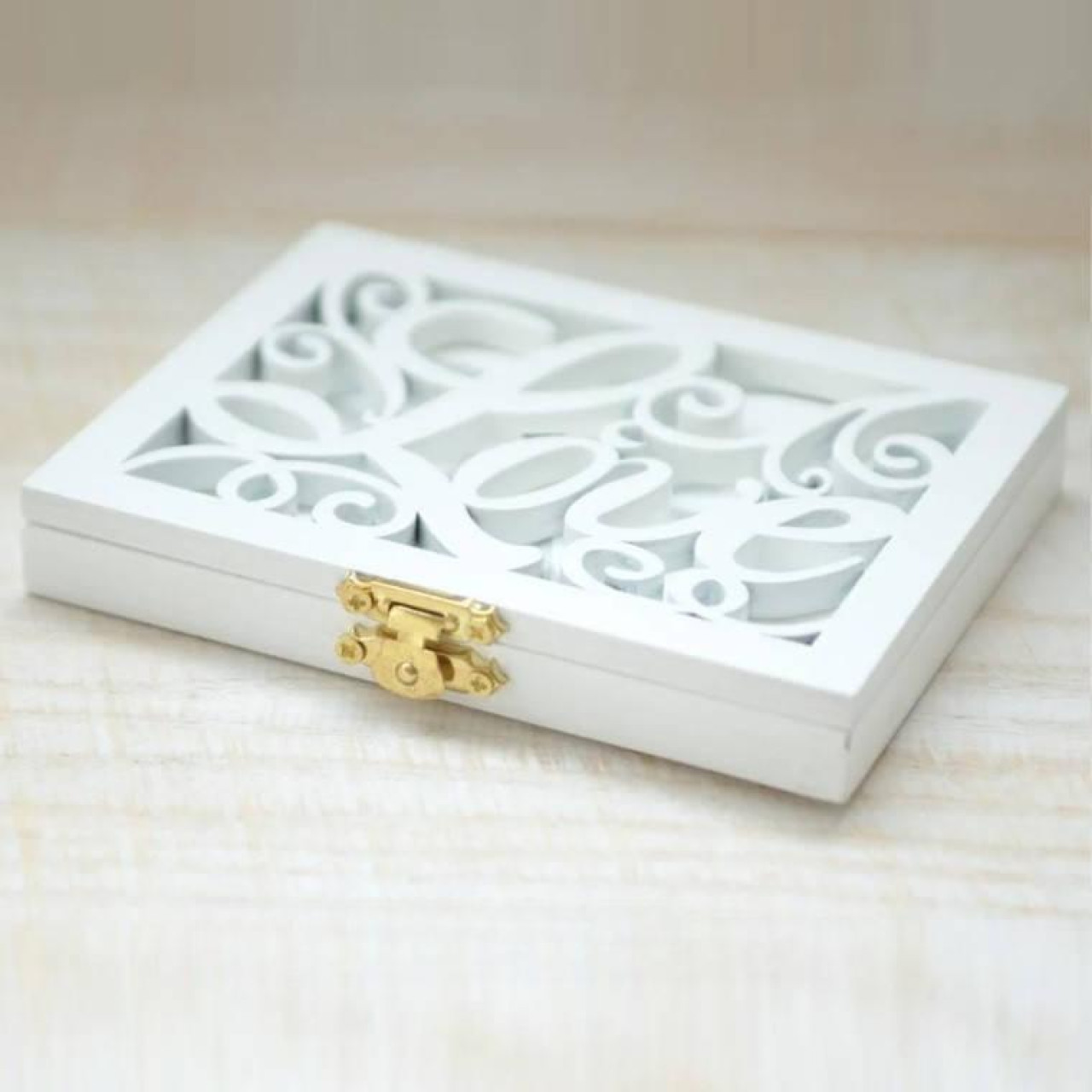 Скринька для обручок "Love" вологостійка фанера ручна робота - цікава й досить практична "коробочка" для багатьох дрібних речей. Як показує практика, немає нічого зручніше для зберігання прикрас, косметики і всіляких дрібниць. В будь-якому приміщенні, в будь-якому інтер'єрі невелика скринька буде виглядати доречно. Такий декоративний скринька можна придбати як для себе, так і на подарунок. У них створюється особливий мікроклімат, який спобствует тривалого зберігання будь-яких речей. Адже під вологостійкої фанери присутні фітонциди, згубні для хвороботворних бактерій і грибків. Причому, навіть невелика скринька впливає на мікроклімат у всьому приміщенні. Так що ваші прикраси ніколи ще не були під надійним захистом.