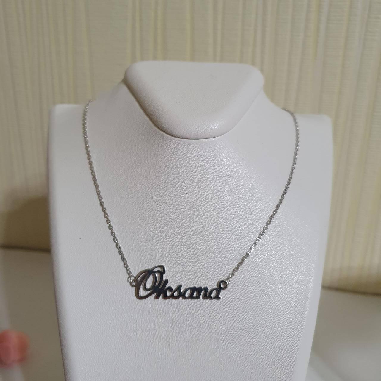Кольє з ім'ям Oksana срібна підвіска на ланцюжку - оригінальне, ніжне і стильна прикраса. Його дизайн простий і тому універсальний, оскільки носити його можна з будь-яким видом одягу: діловий, кежьюал, вечірній, стріт-стайл та інші. Зручність і комфорт - це 2 основні критерії в цьому кольє. До речі, кольє - це таке універсальне прикраса, де кулон не треба підбирати до ланцюжку, а ланцюжок до підвісці, оскільки вони обидва вже зібрані і красиво закомпонованы дизайнером-ювеліром. Стиль написання імені також підбирається індивідуально під кожне слово. Ви можете вибрати будь-який напис, ім'я і навіть мова виконання. Наявність каменів вставок і іншого декору. Наш майстер виконає всі ваші доповнення зі срібла 925 проби. Можливо нанесення позолоти 585 проби.