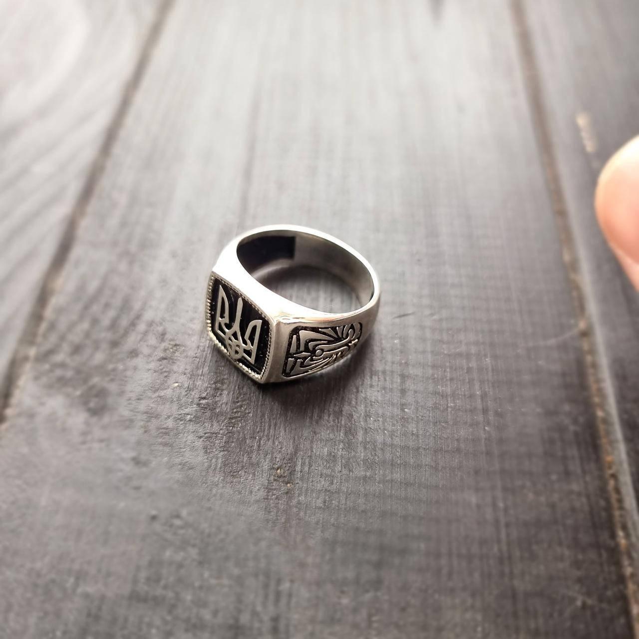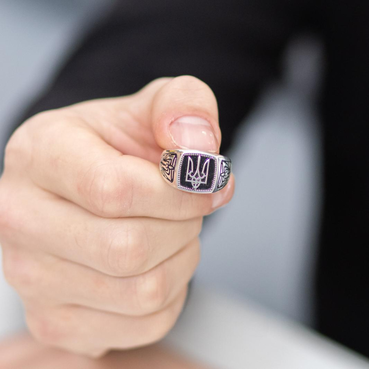 Печатка срібна Герб України Тризуб із чорною емаллю - масивна та стильна чоловіча каблучка. Перстень із Тризубом зі срібла – це ваш надійний захисник на всі часи. Немов срібний хрест на ланцюжку, натільна ладанка або універсальна каблучка "Врятуй і Збережи", вона берегтиме вас і надаватиме сили витримати найважчі життєві випробування. Атрибутика державності на цьому срібному персні виготовлена об'ємно та виділяється за допомогою чорної емалі на срібній основі. З боків, середню частину підтримують два таких самих об'ємних візерунка, затемнені емаллю. Вона наноситься на срібло 925 проби за допомогою високих температур, тому довго тримається і не стирається. Завдяки такому продуманому дизайну, срібна патріотична каблучка виглядає мужньо і виділяє свого власника в компанії. Носити її можна щодня. Чоловіча каблучка зі срібла з гербом – універсальна, тому підходить під будь-який образ.