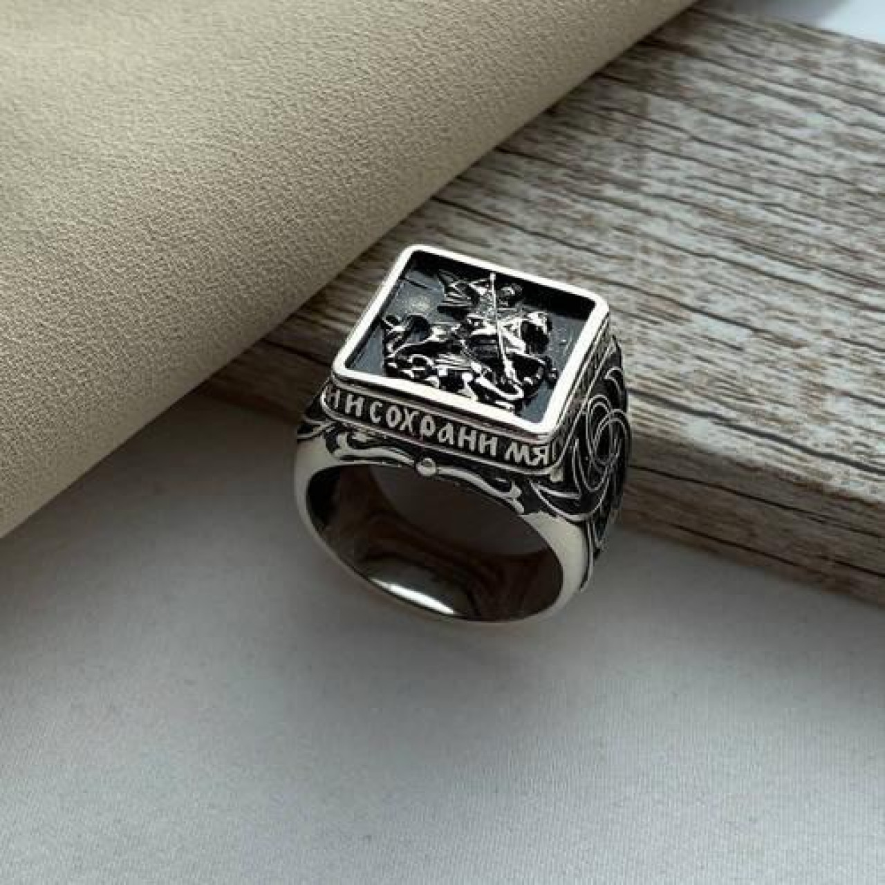 Георгій Побідоносець із чорнінням 524-3 стане символом сили та захисту, підкреслюючи мужність та індивідуальність свого власника. У центрі персня розташований образ Георгія Побідоносця - покровителя воїнів і захисника віри, що символізує перемогу добра над злом. З боків персня розміщений витончений орнамент, а під центральним зображенням вигравірувано напис Спаси і Збережи мене, що надає прикрасі глибокого духовного сенсу. Чорніння підкреслює деталі дизайну, надаючи перстню особливої виразності та унікальності. Масивний срібний перстень 524-3 прекрасно поєднується з будь-яким стилем - його можна носити з повсякденним вбранням, діловим костюмом або використовувати як акцент в образі для святкового заходу. Наприклад, намагайтеся знімати перстень зі срібла 925 проби з чорнінням, перед взаємодією з хімічними речовинами, промивайте його раз на місяць у мильній воді та просушуйте рушником.