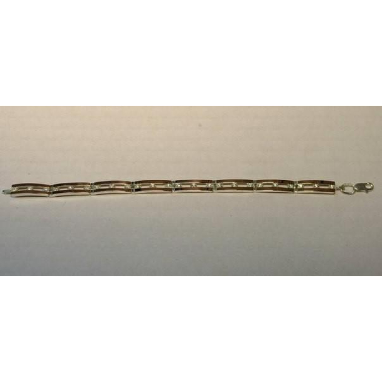 Модель виконана з прямокутних елементів ніжно примикають між собою. По середині кожного елемента знаходиться витончена вставка з дрібних каменів циркону. Модель буде гармонійно виглядати з вечірнім нарядом, а також додасть неповторності в повсякденному стилі. Пластини зі срібла з позолотою, з яких і створювався браслет здатні показати справжній чудовий смак свого власника. Його непорочність, досконалість. Прямокутні з красивими геометричними формами елементи переливаючись на вашій кисті руці сяйвом і блиском гарантовано будуть зачаровувати оточуючих і притягувати до себе погляди.