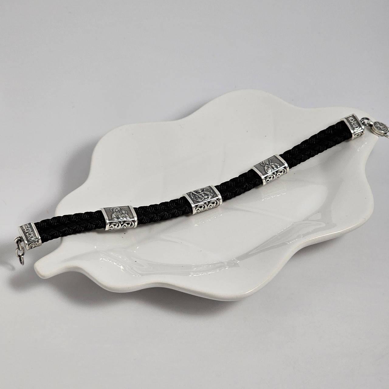 Браслет чорний зі срібними вставками з образами святих шовковий на руку