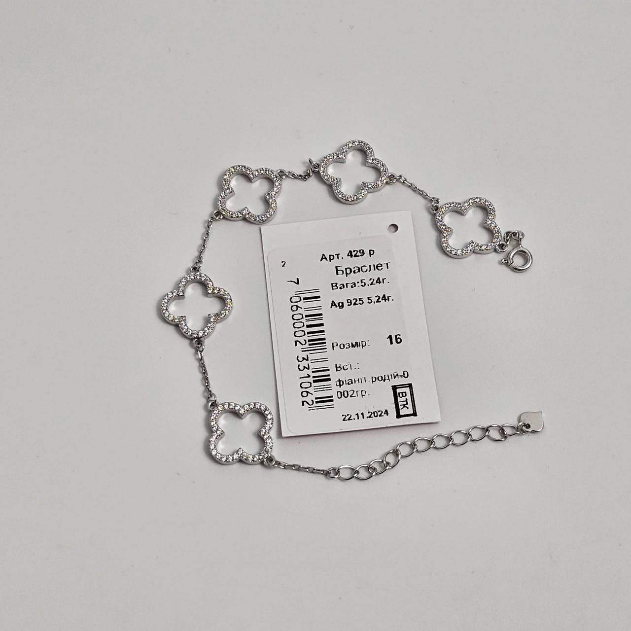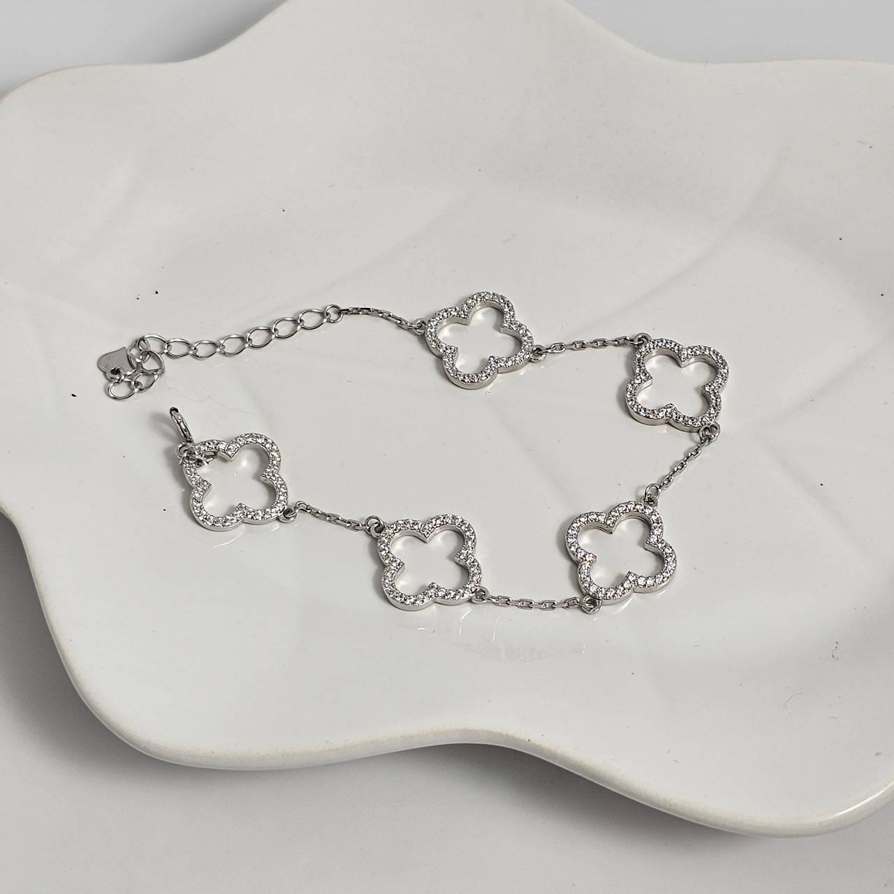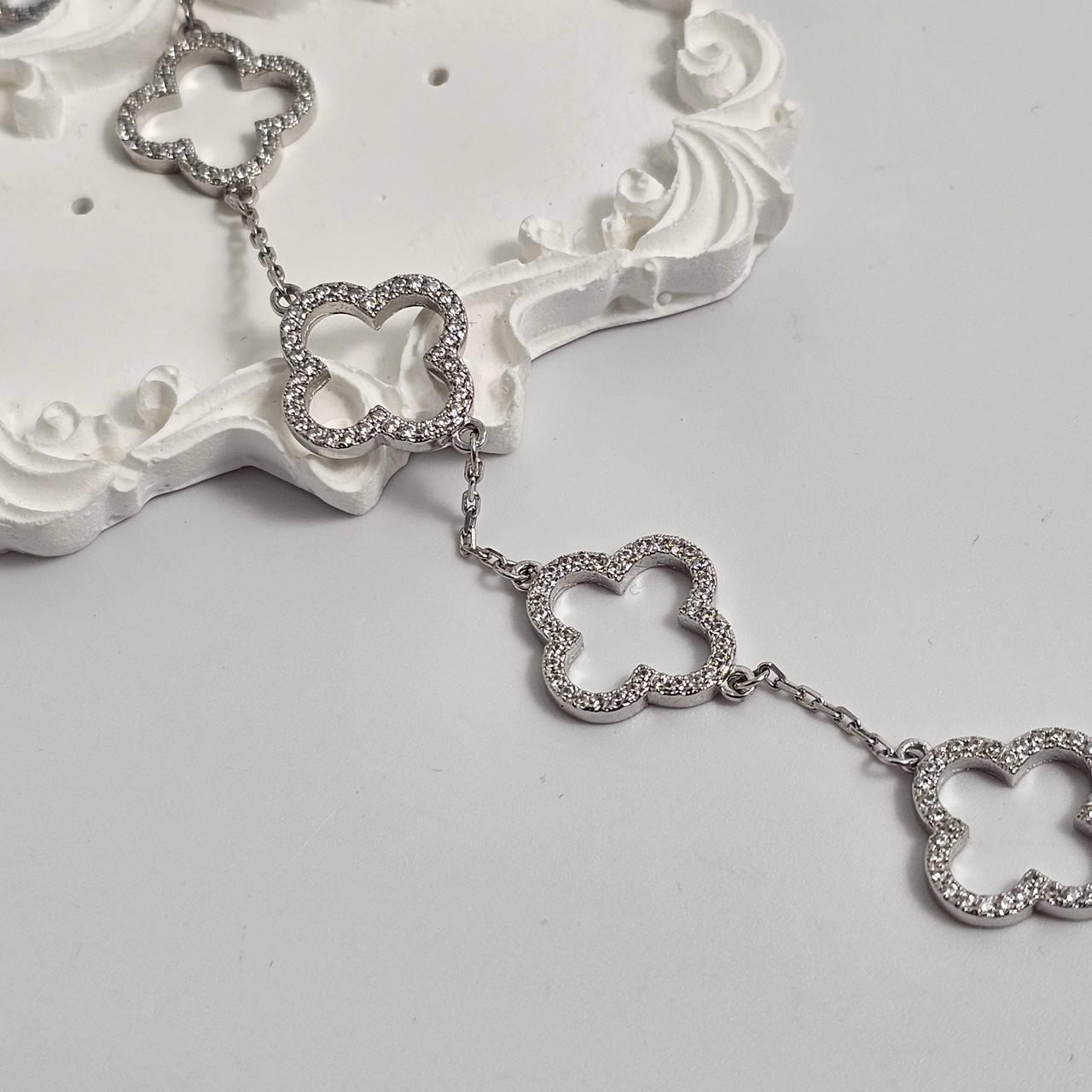 Браслет срібний клевер з білими круглими фіанітами