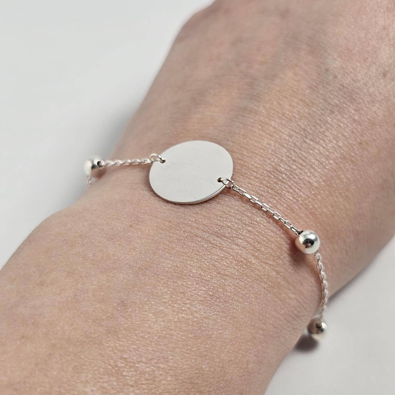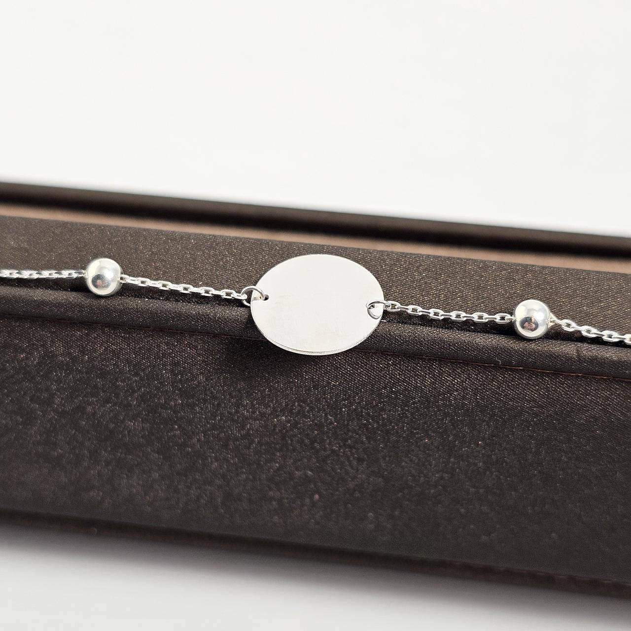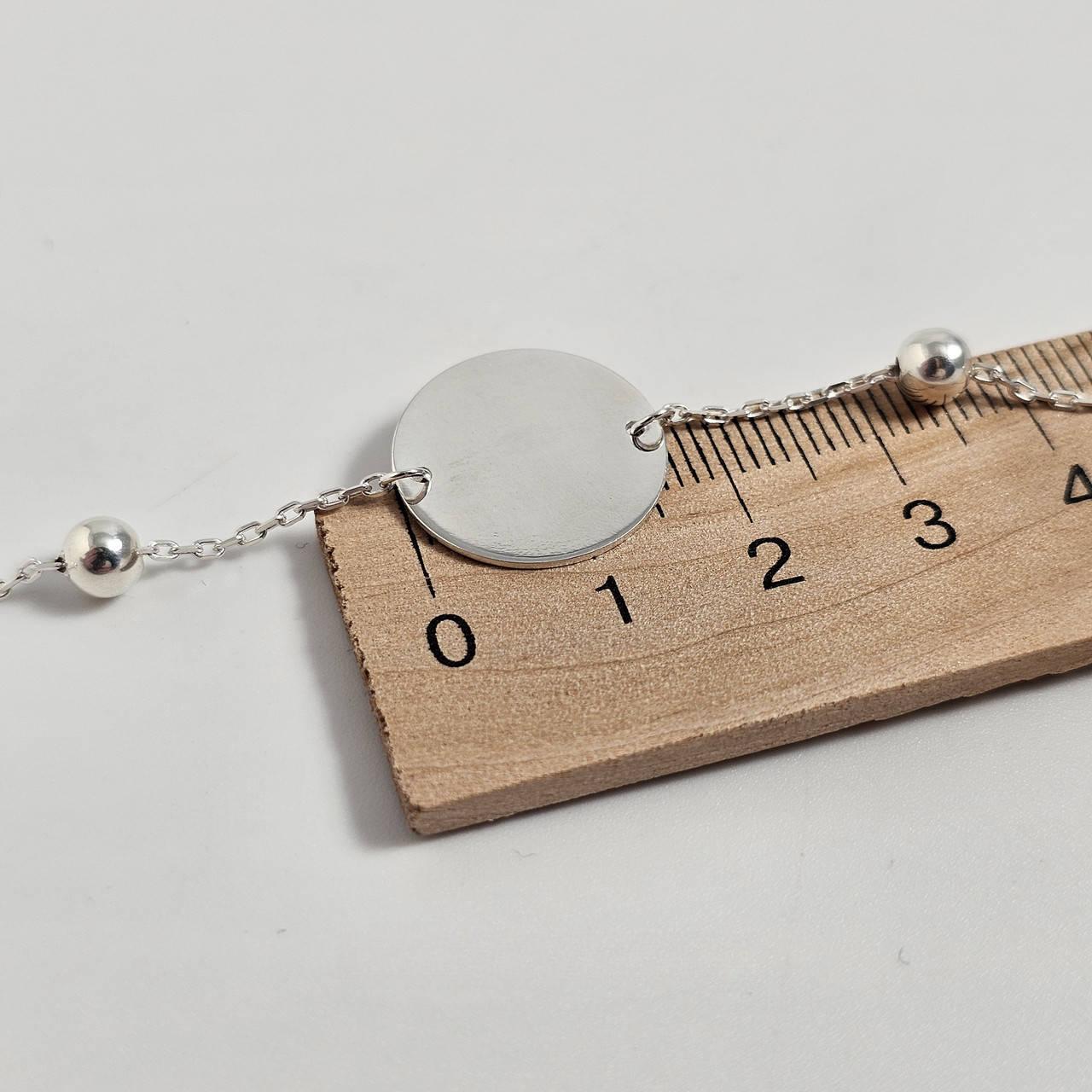 Срібний браслет 324/5/01-3 з підвісками - це вишукана прикраса, що поєднує в собі ніжність форми та сучасний стиль. Її основа виконана у вигляді тонкого, витонченого ланцюжка, прикрашеного мініатюрними срібними кульками, рівномірно розподіленими по всій довжині. Особливу увагу привертає центральна підвіска - плоский круглий диск з м'яким блиском полірованого срібла, що створює гармонійний акцент і надає браслету витонченого характеру. Браслет зі срібла 324/5/01-3 легко впишеться в повсякденний гардероб, додавши образу легкості та завершеності. Він також прекрасно доповнить вечірню або урочисту сукню, підкресливши жіночність і смак своєї власниці. Завдяки своєму універсальному дизайну і символіці кола як знаку цілісності та гармонії, браслет стане не просто прикрасою, а особистим амулетом. Виготовлений браслет зі срібла 925 проби, тому він довго залишатиметься таким ніби ви його щойно купили. Але все ж таки мінімальний догляд необхідний, достатньо раз на місяць промити браслет зі срібла в мильній воді та просушити рушником. На поверхню центрального підвісу можна нанести персональне гравіювання - ім'я, дату, слово або фразу, що зберігатиме особисту історію та надасть підвісці ще глибшого сенсу.