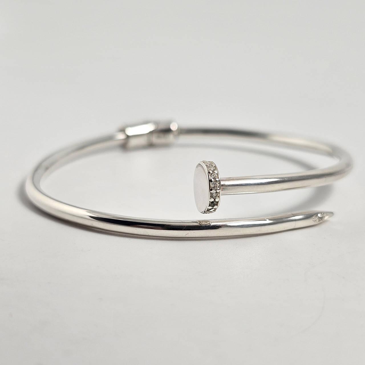 Срібний браслет 178-3 у вигляді цвяха - це не просто стильна прикраса, а сміливе дизайнерське висловлювання, в якому гармонійно поєднуються сила форми і витонченість деталей. Її унікальний силует повторює вигин цвяха, символізуючи стійкість, непохитність і впевненість у собі. Таку прикрасу обирають ті, хто не боїться виділятися і прагне підкреслити свою індивідуальність через деталі. На особливу увагу заслуговує капелюшок браслета - він інкрустований білими фіанітами, що виблискують при кожному русі. Це каміння немов грає з променями світла, надаючи браслету ошатного блиску й ефектної завершеності. Їхнє чисте сяйво контрастує з чіткими лініями металу, створюючи тонкий баланс між м'якою жіночністю і рішучим характером. Браслет зі срібла 178-3 легко одягається і комфортно відчувається на руці. Прикраса виконана зі срібла, що надає їй благородного вигляду та універсальності - вона легко поєднується як з лаконічними повсякденними образами, так і з вишуканим вечірнім вбранням. Жорстка форма браслета забезпечує його міцність і зберігає бездоганну посадку на зап'ясті. Виготовлений браслет зі срібла 925 проби, тому він довго залишатиметься таким ніби ви його щойно купили. Але все ж таки мінімальний догляд необхідний, достатньо раз на місяць промити браслет зі срібла в мильній воді та просушити рушником.