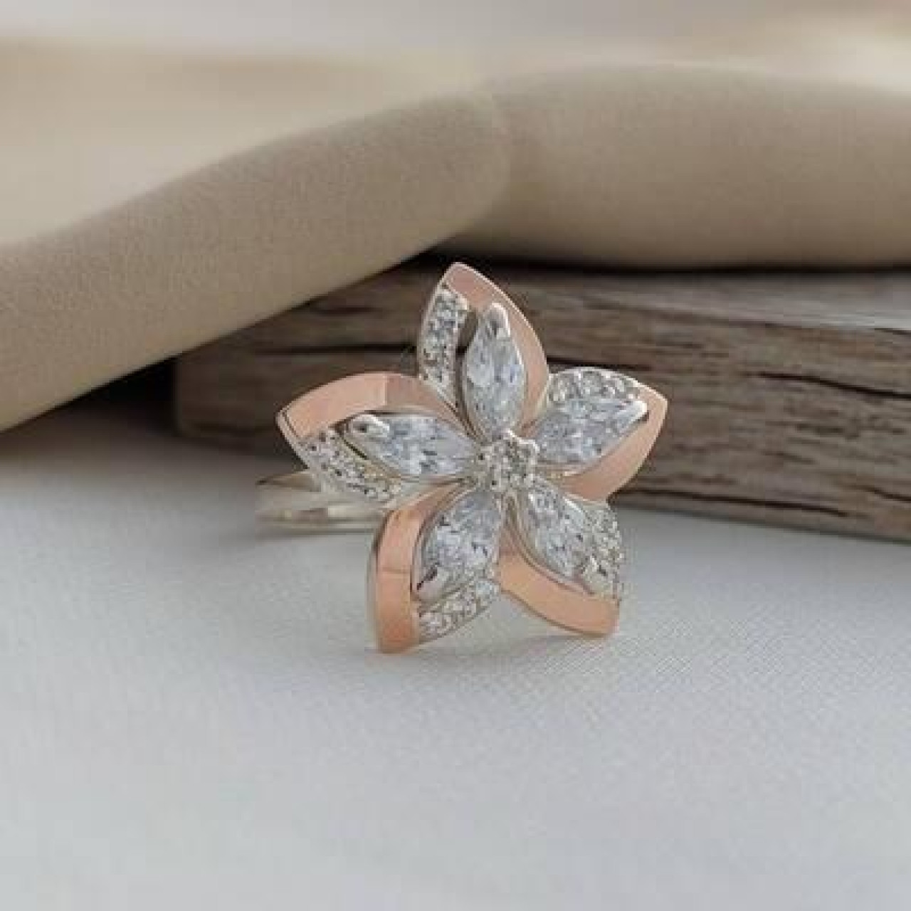 Каблучка срібна квітка із золотими напайками та білими цирконами різного розміру