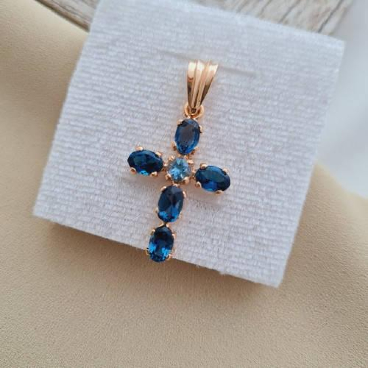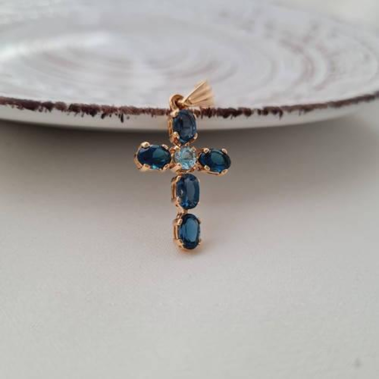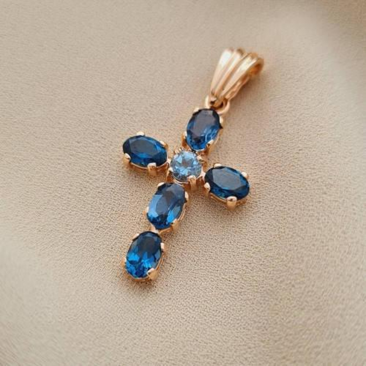 Хрестик золотий з овальними синіми топазами під ланцюжок або шнур 3.42