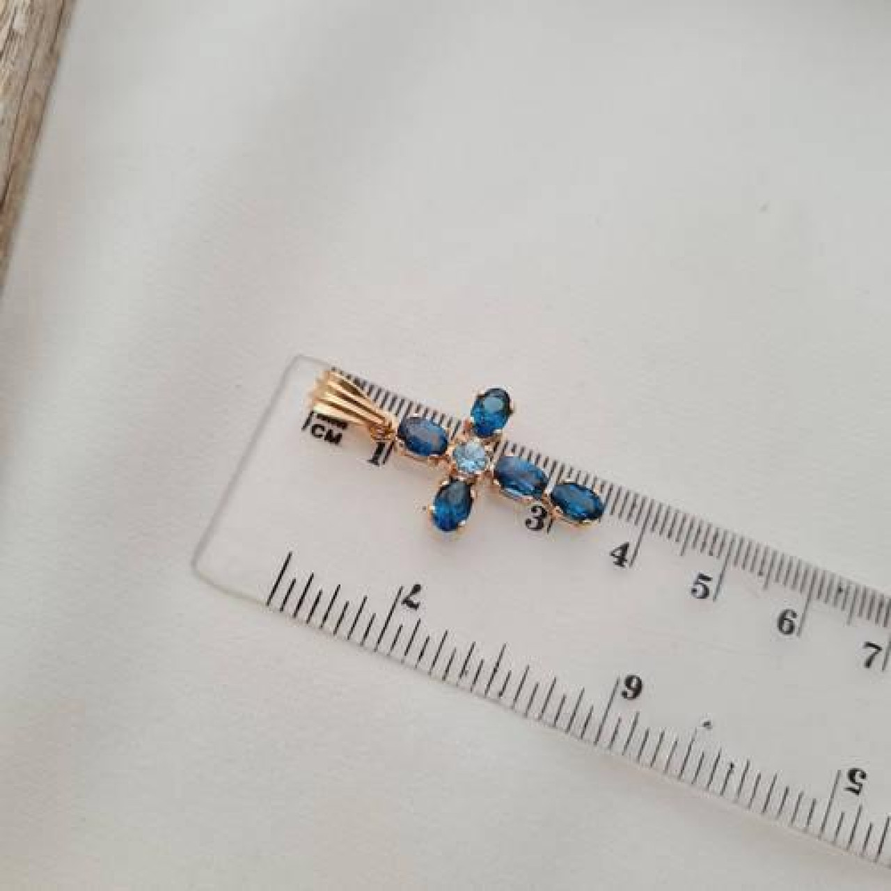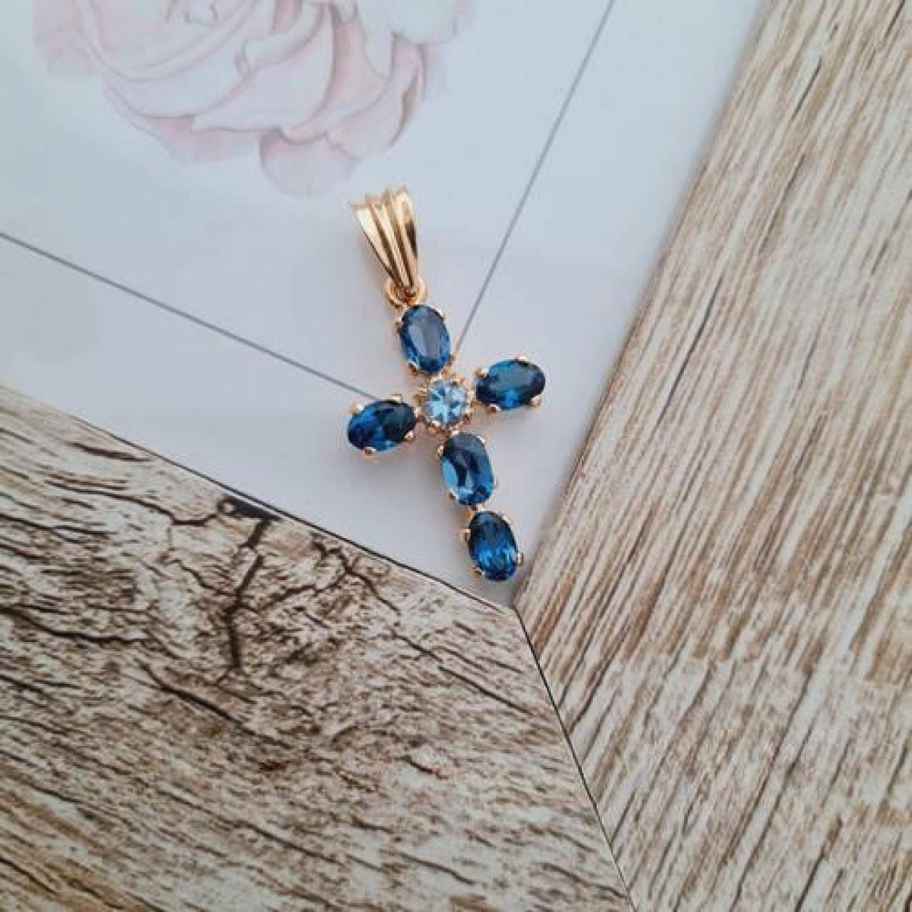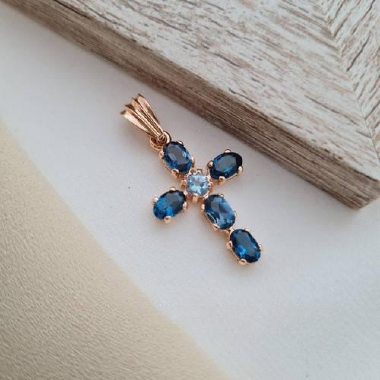 Хрестик золотий з овальними синіми топазами під ланцюжок або шнур 3.42