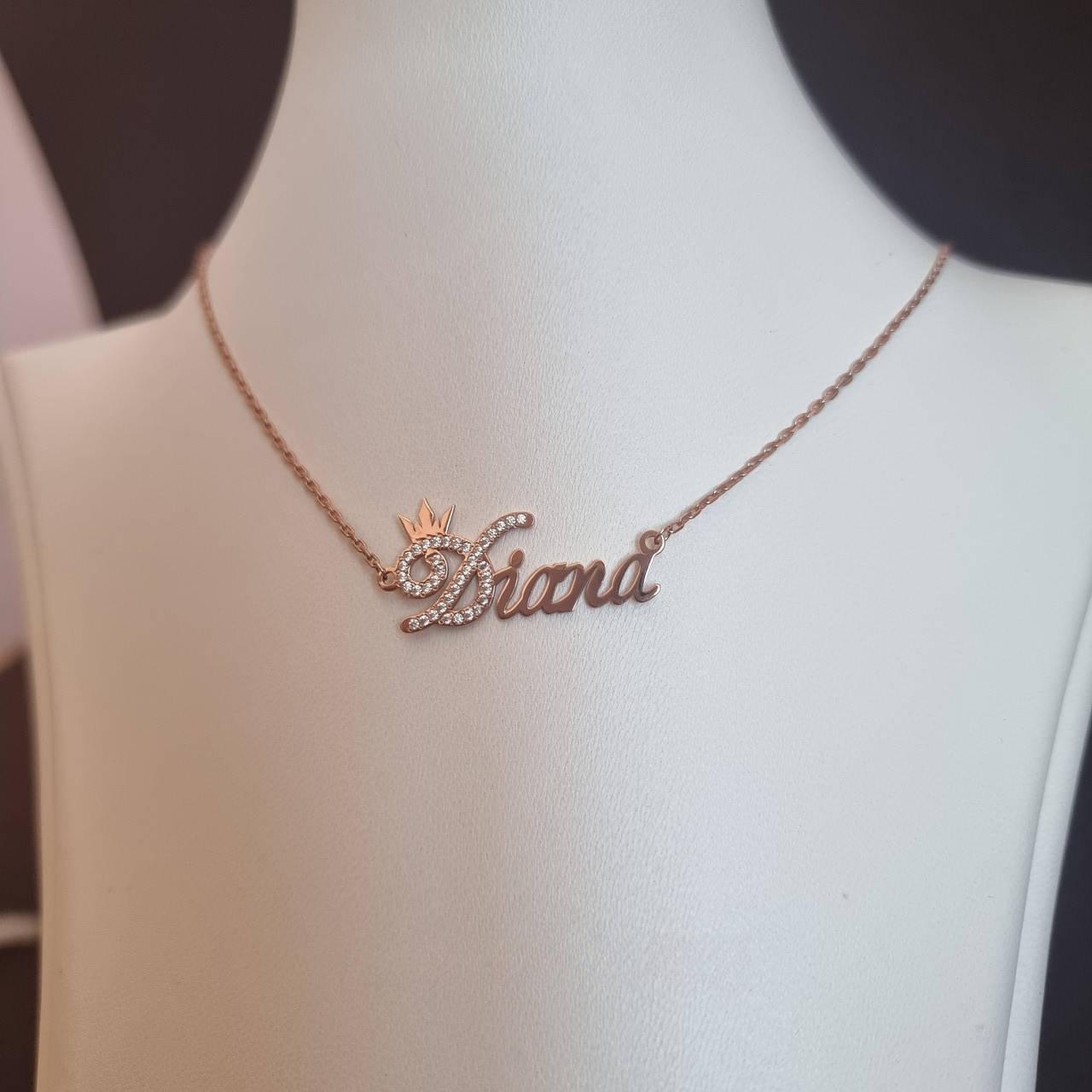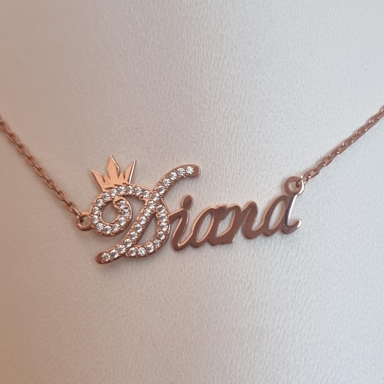 Тендітне срібне іменне кольє з позолотою Діана з найвищою срібною пробою 925, золотом 585 проби та білими фіанітами, які чудово переливаються та виблискують на денному й штучному світлі. Прикрасу виготовляємо на замовлення будь-якого імені або напису. Маємо великий вибір різного гравіювання, а також можете створити своє індивідуальне. Обирайте із якого саме металу хочете замовити. Вибір між сріблом, золотом та срібло в позолоті. Ця прикраса може слугувати подарунком для всіх вікових категорій, будьте певні, що мама, бабуся чи дівчина будуть у захваті від подарованого Вами кольє. Іменне кольє робимо в розмірах від 35 до 60 см.