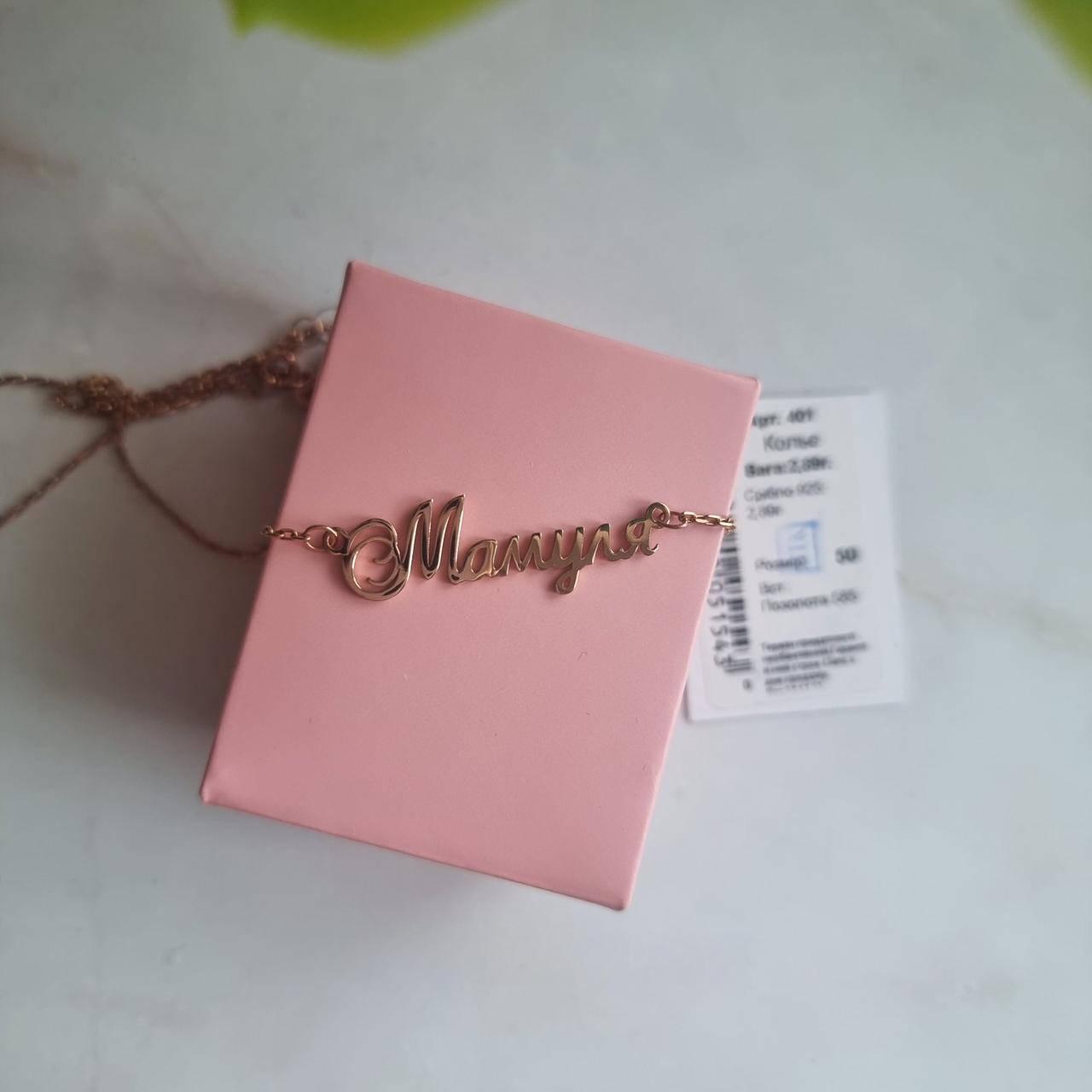 Кольє срібне з позолотою Мамуля на тонкому ланцюжку виготовлено із срібла 925 проби, та покрито позолотою 585 пробою. Така прикраса дуже оригінальна, святковата та особиста. Вона додає індивідуальності вам, а ви прикрашаєте її власним ім'ям, важливим словом, фразою. Ми можемо виготовити для вас будь-який невеличкий напис, навіть з власним стиелм літер, та оздоблення. До виписиних з дорогоцінного металу літер можна додати камінчик, особливий знак, корону, сердечко, сонечко тощо, все, на що вистачить вашої уяви. Шрифт - має значення, тож його також можна підібрати індивідуально.
