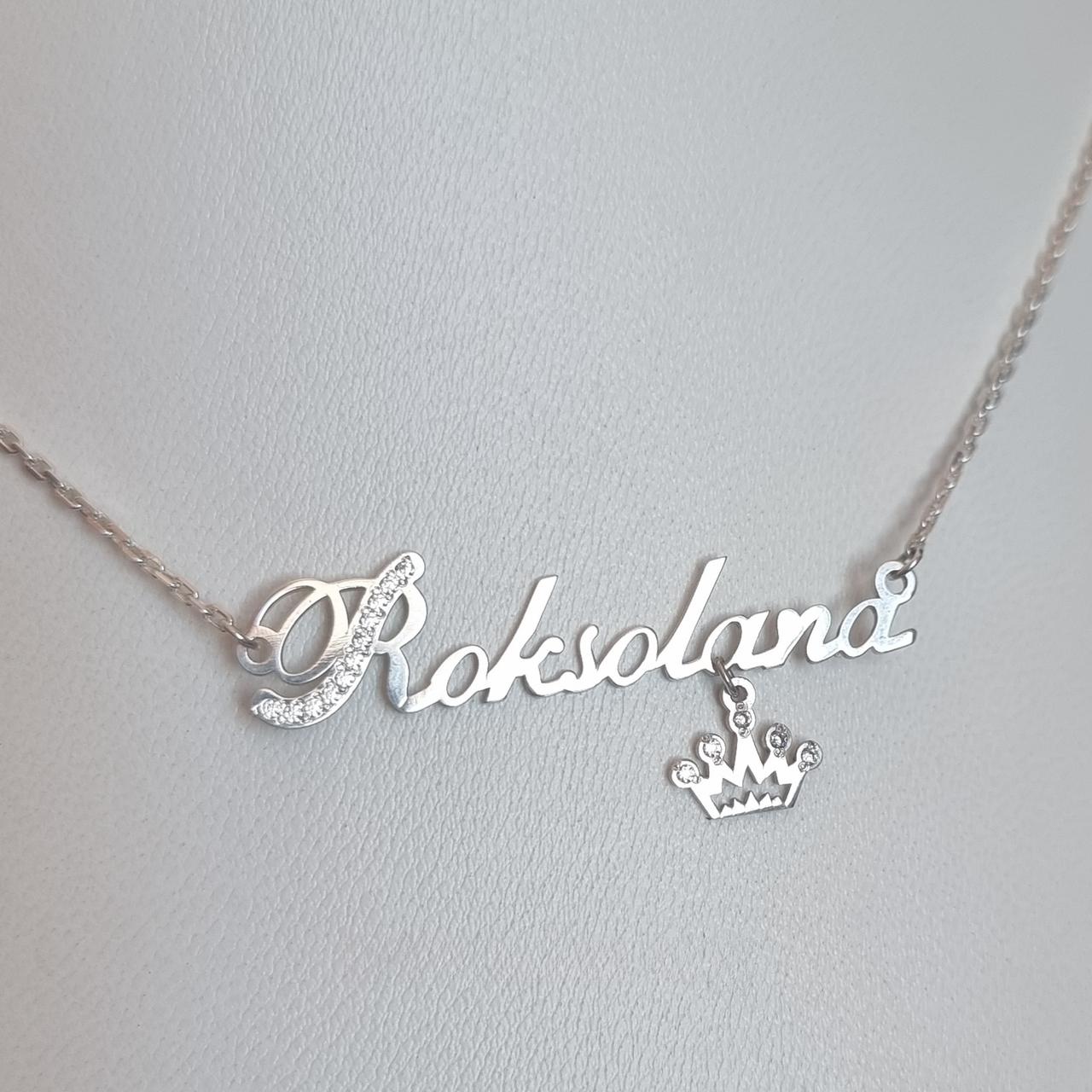 Срібне іменне кольє Роксолана з короною фіаніти і гравірування жіноче, 925 проба