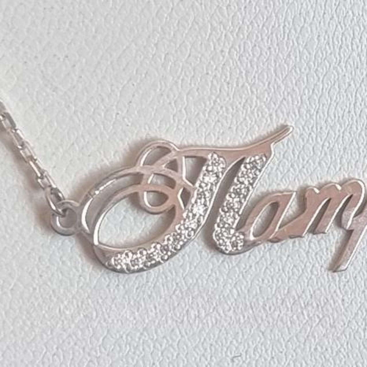 Тендітне срібне іменне кольє Патрина з найвищою срібною пробою 925 та білими фіанітами, які чудово переливаються та виблискують на денному й штучному світлі. Прикрасу виготовляємо на замовлення будь-якого імені або напису. Маємо великий вибір різного гравіювання, а також можете створити своє індивідуальне. Обирайте із якого саме металу хочете замовити. Вибір між сріблом, золотом та срібло в позолоті. Ця прикраса може слугувати подарунком для всіх вікових категорій, будьте певні, що мама, бабуся чи дівчина будуть у захваті від подарованого Вами кольє. Іменне кольє робимо в розмірах від 35 до 60 см.
