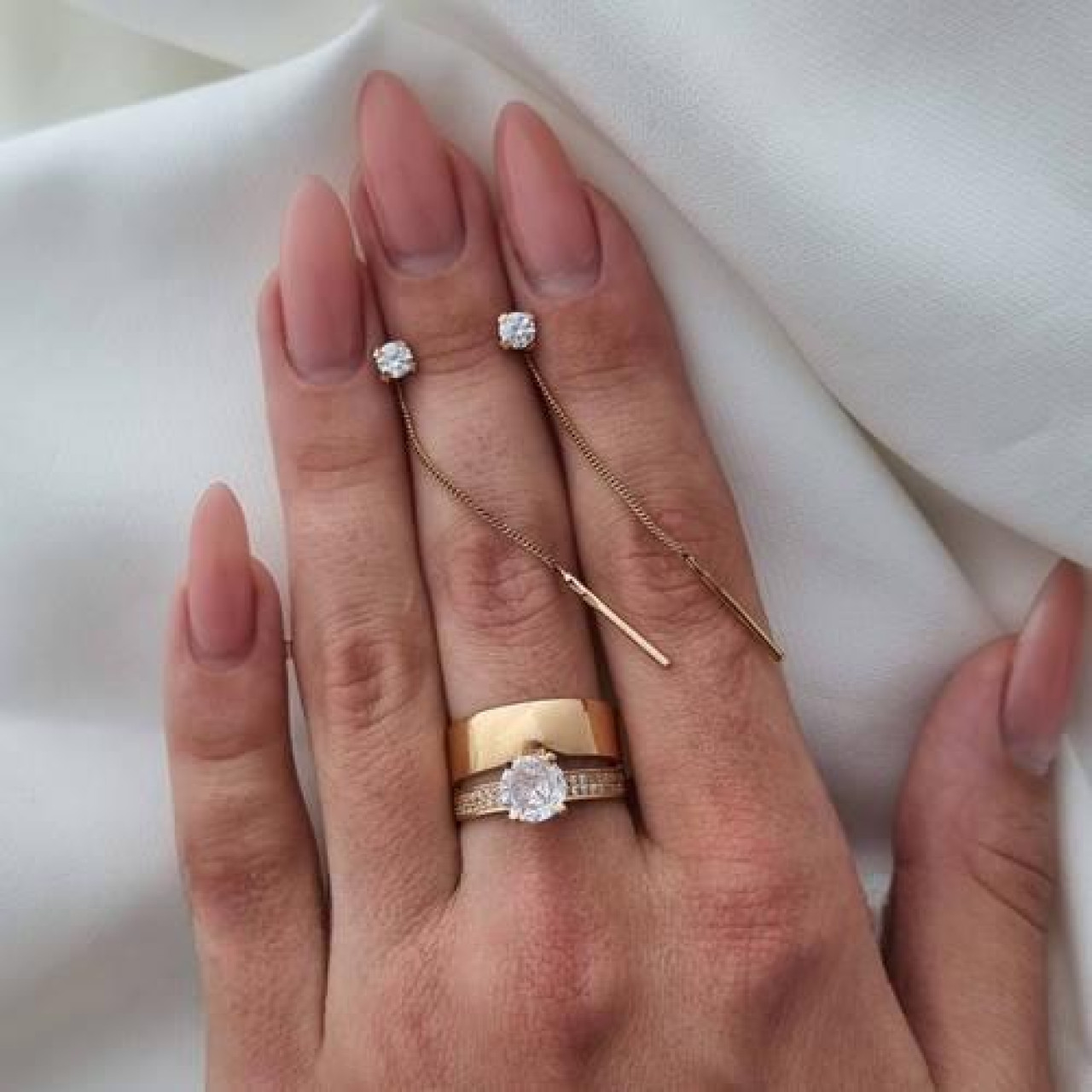 Вишуканий позолочений комплект прикрас, який додасть образу нотку розкоші. Комплект складається з позолоченої подвійної каблучки та позолочених сережок протяжок, які об'єднують білі круглі циркони. Камінчики блищать і переливаються в денному і штучному світлі, відкидаючи навколо красиві відблиски. Комплект срібних прикрас у позолоті прикрасить собою вбрання для святкового заходу, підкреслить його елегантність і вишуканість. Комплект прикрас із позолоти з цирконами приверне увагу до своєї власниці. У подвійній каблучці широка частина гладка і блискуча, а вузька частина всипана маленькими білими цирконами, що підтримують блиск центрального великого круглого каменю. Сережки протяжки надійно утримуватимуться у вусі попри відсутність класичної застібки. Для того, щоб підтримувати позолочений комплект у первозданному вигляді, вам не знадобляться будь-які хімічні речовини. Досить періодично протирати його шматочком фланелі або мікрофібри.