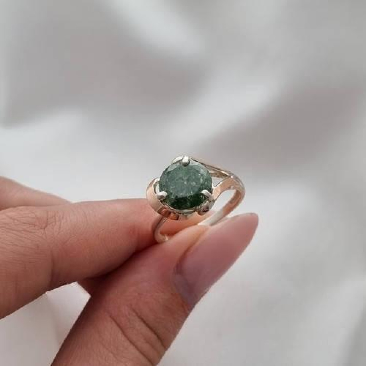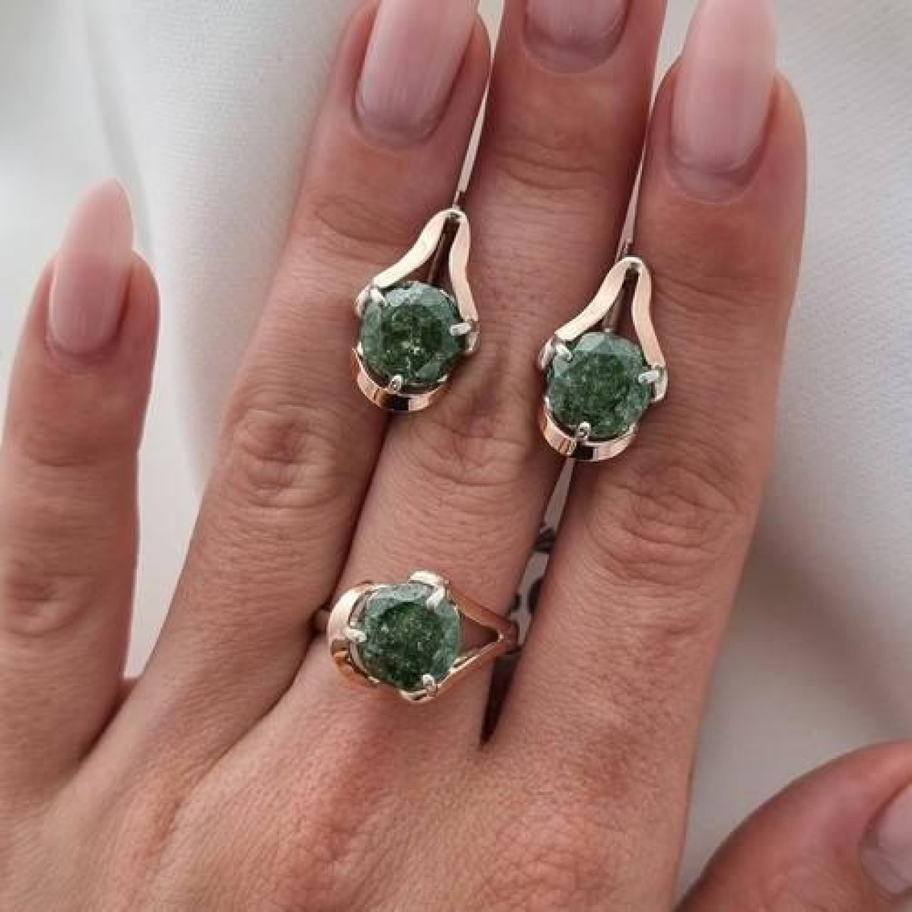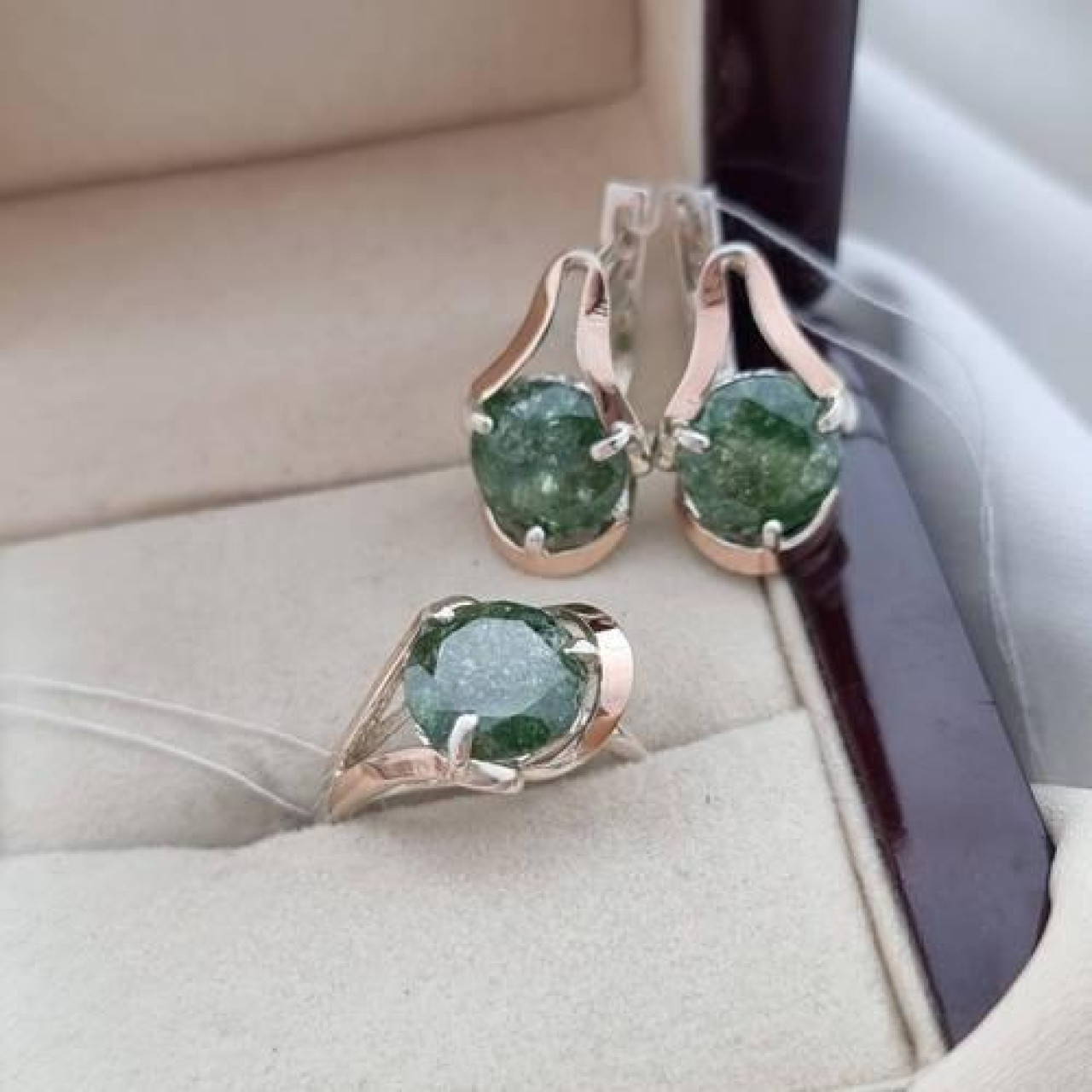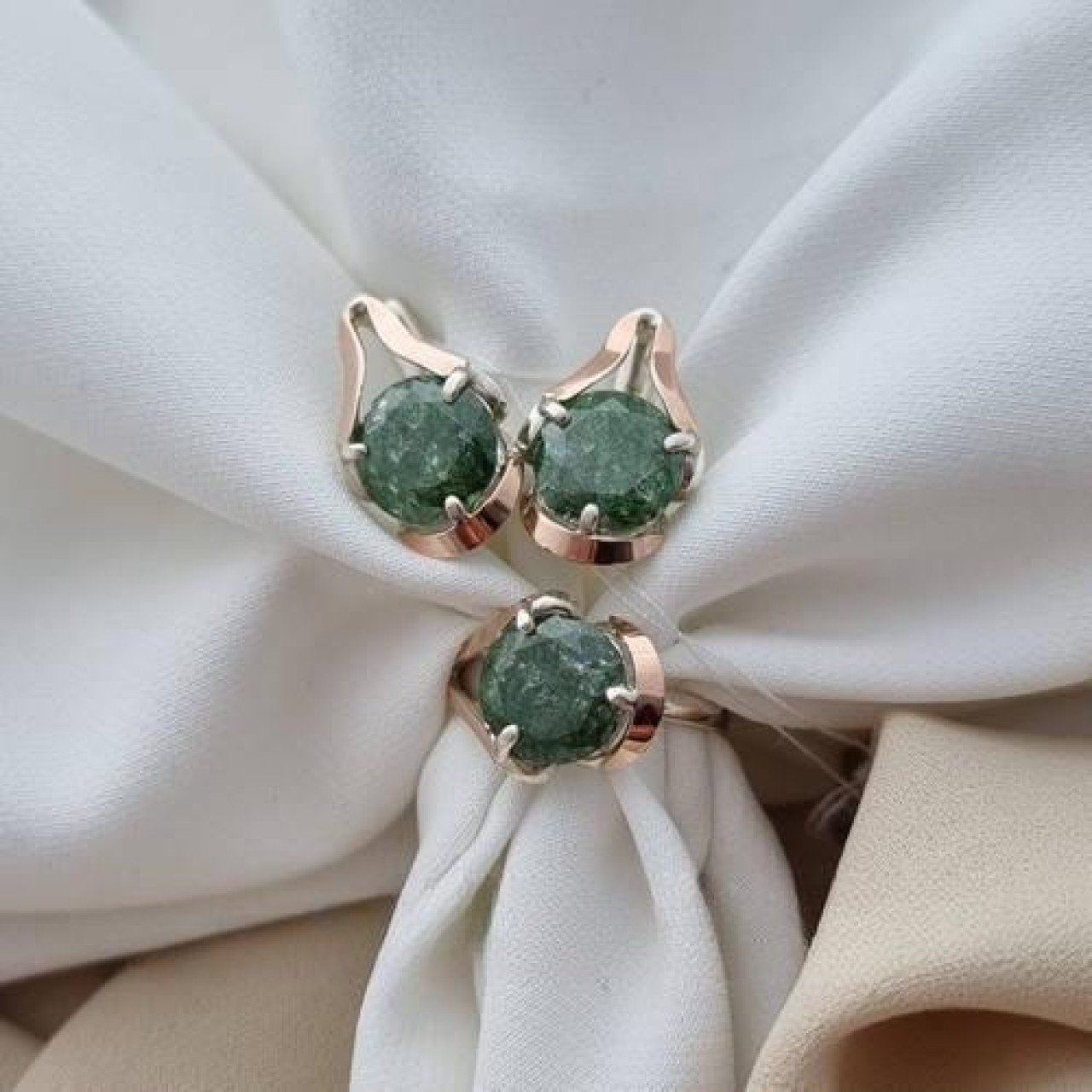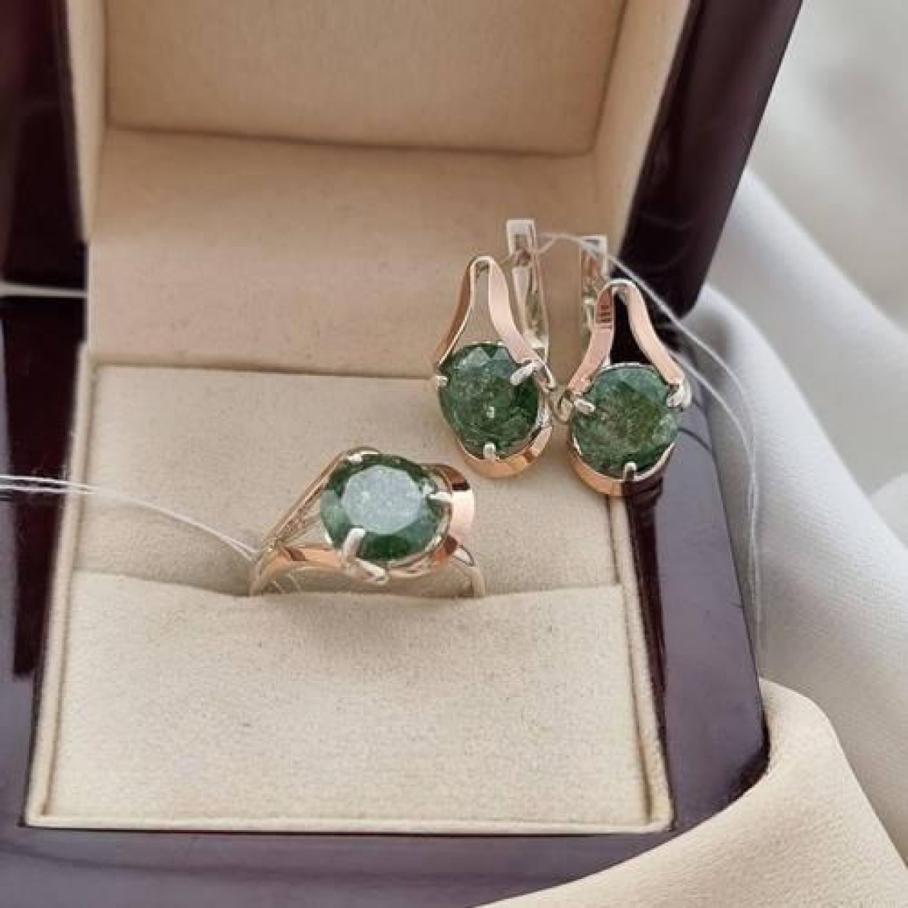 Комплект ювелірних прикрас каблучка та сережки виготовлений з якісного срібла та оздоблений золотими напайками і яскравим зеленим камінням. Золоті пластини в прикрасах додають виробам шику та блиску і відтіняють гарний яскравий колір каміння. Ювелірний гарнітур зі срібла і золота сережки і каблучка матиме гарний вигляд і з офісним образом, підкреслюючи його суворість і елегантність, і з повсякденним вбранням, і з образом для урочистого заходу. Застібка на срібних із золотом і круглим камінням сережках - англійський замок, він дуже надійний і не дасть загубитися сережкам. Виготовлені каблучка та сережки зі срібла 925 проби та із золота 375 проби. Доглядати за таким комплектом ювелірних прикрас дуже просто - раз на місяць промивайте його в мильній воді та просушуйте рушником і він тішитиме вас дуже довго своїм блиском і сяйвом.