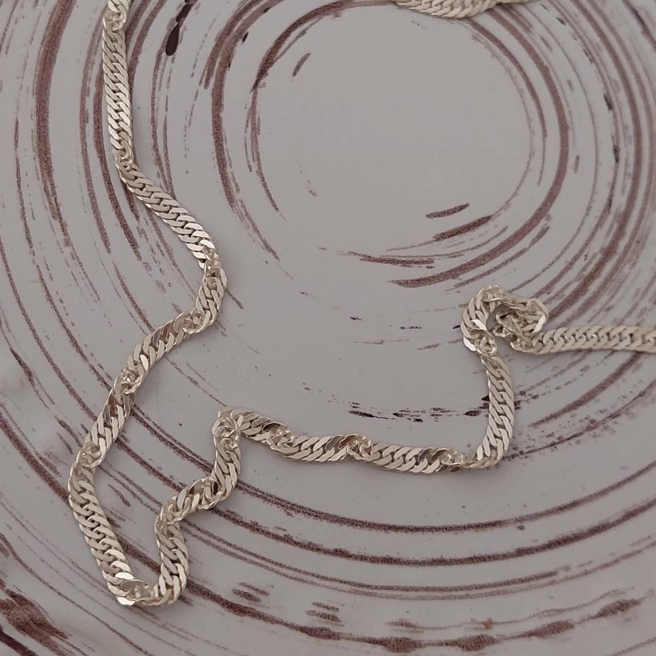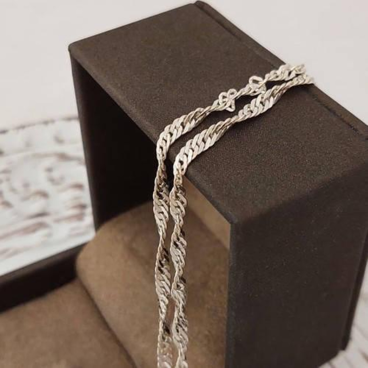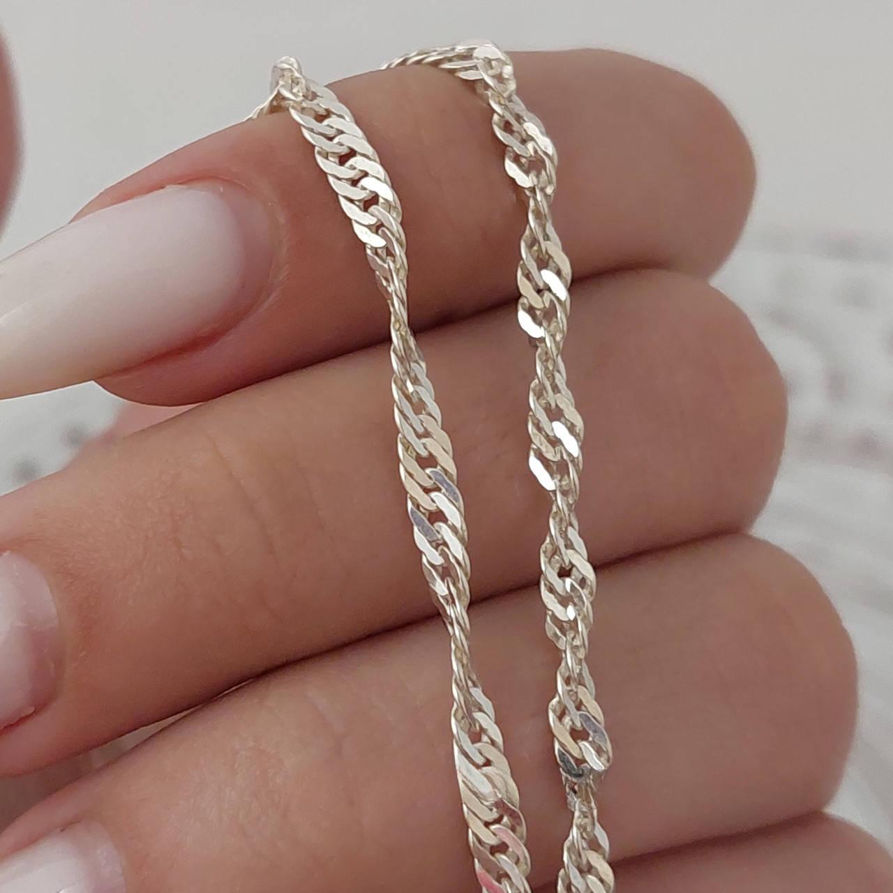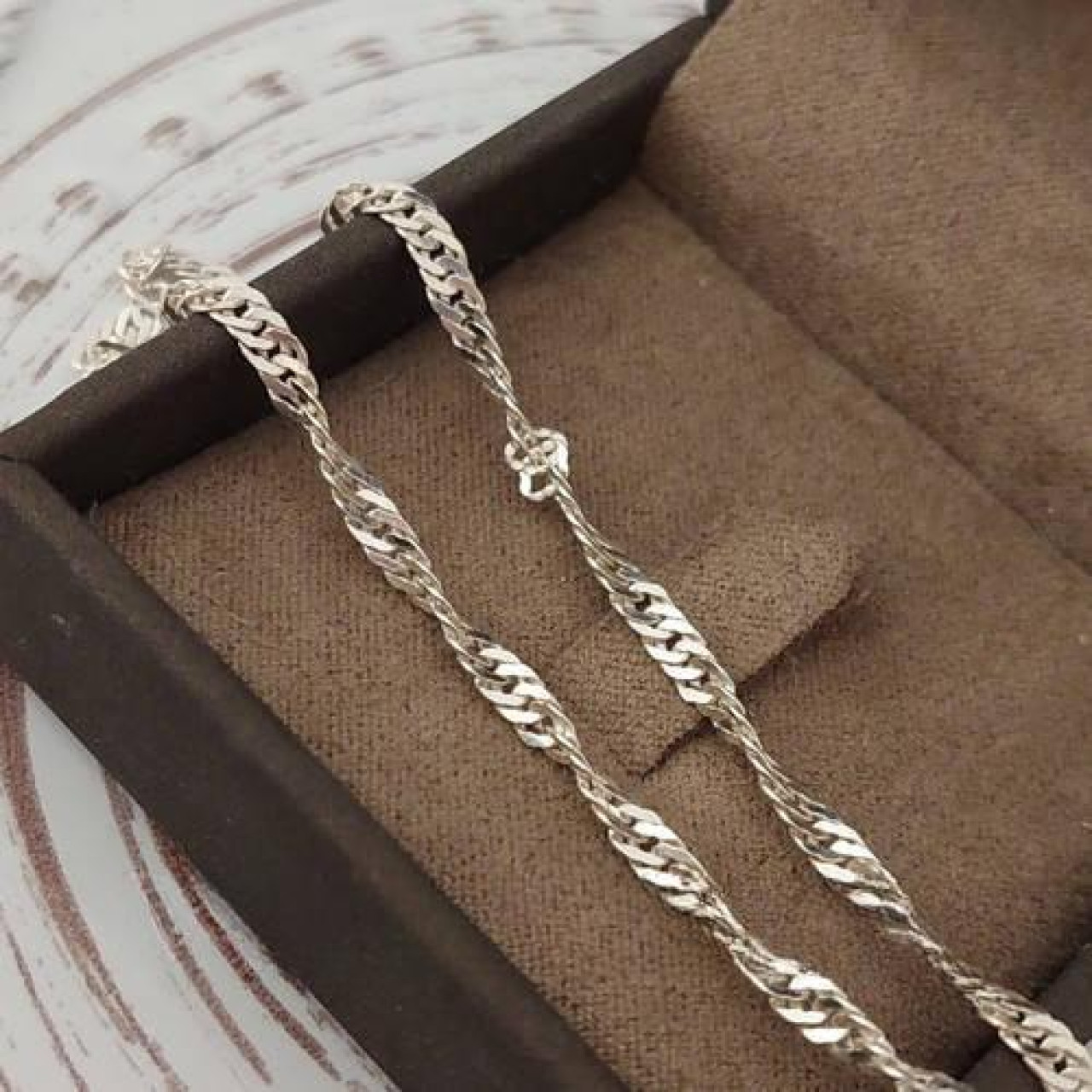 Срібний жіночий ланцюжок з плетінням Сінгапур може чудово доповнити ваше повсякденне або офісне вбрання розставивши правильно акценти. Ланцюжок має цікавий дизайн, він ніби перекручується, створюючи певний спіралеподібний вигляд. Грані ланок ланцюжка з плетінням Сінгапур блищать і переливаються на світлі, привертаючи увагу до ланцюжка та його володарки. Срібний ланцюжок можна доповнювати кулонами або підвісами й таким чином доповнювати та підкреслювати цю вишукану прикрасу. Виготовлено ланцюжок зі срібла 925 проби, тому він довго залишатиметься таким ніби ви його щойно купили. Але все-таки мінімальний догляд необхідний, достатньо раз на місяць промити ланцюжок зі срібла в мильній воді, просушити рушником.