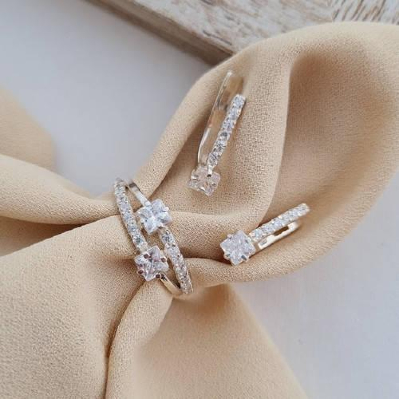 Срібний комплект каблучка та сережки з цирконами 243-0 стане справжньою прикрасою для будь-якої дівчини. Цей комплект включає каблучку і сережки, що гармонійно поєднуються одна з одною. Каблучка складається з двох частин, кожна з яких прикрашена великим квадратним цирконом і маленькими круглими цирконами, що створюють ефектний блиск і витонченість. Сережки виконані в тому ж стилі, також прикрашені маленькими цирконами і великим квадратним цирконом у центрі, що надає комплекту цілісного і завершеного вигляду. Камінці чудово блищать і переливаються під час потрапляння на них світла, додаючи особливого шарму і витонченості всьому комплекту. Каблучка та сережки зі срібла з білим камінням 243-0 ідеально підходить як для повсякденного носіння, додаючи елегантності та стилю в буденні образи, так і для святкових заходів, підкреслюючи вашу індивідуальність і неповторність. Срібні сережки, що мають надійні англійські замки, надійно триматимуться в мочках вух. Каблучка зі срібла має такі розміри: 15, 15,5, 16, 16,5, 17, 17,5, 18, 18,5, 19, 19,5, 20, 20,5, 21. Виготовлений комплект прикрас зі срібла 925 проби і покритий родієм, що забезпечує йому захист від потемніння та механічних пошкоджень. Догляд за таким ювелірним гарнітуром дуже простий - раз на місяць промивайте його в мильній воді і просушуйте рушником, і він буде радувати вас дуже довго своїм блиском і сяйвом.