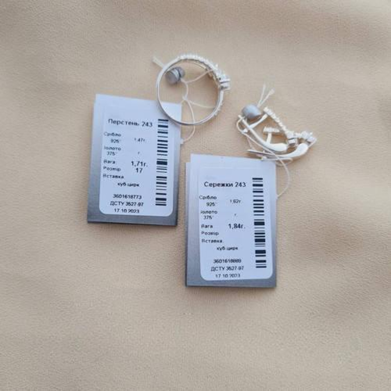 Набір виконано зі срібла 925 проби, що засвідчено клеймом ювелірної палати України.