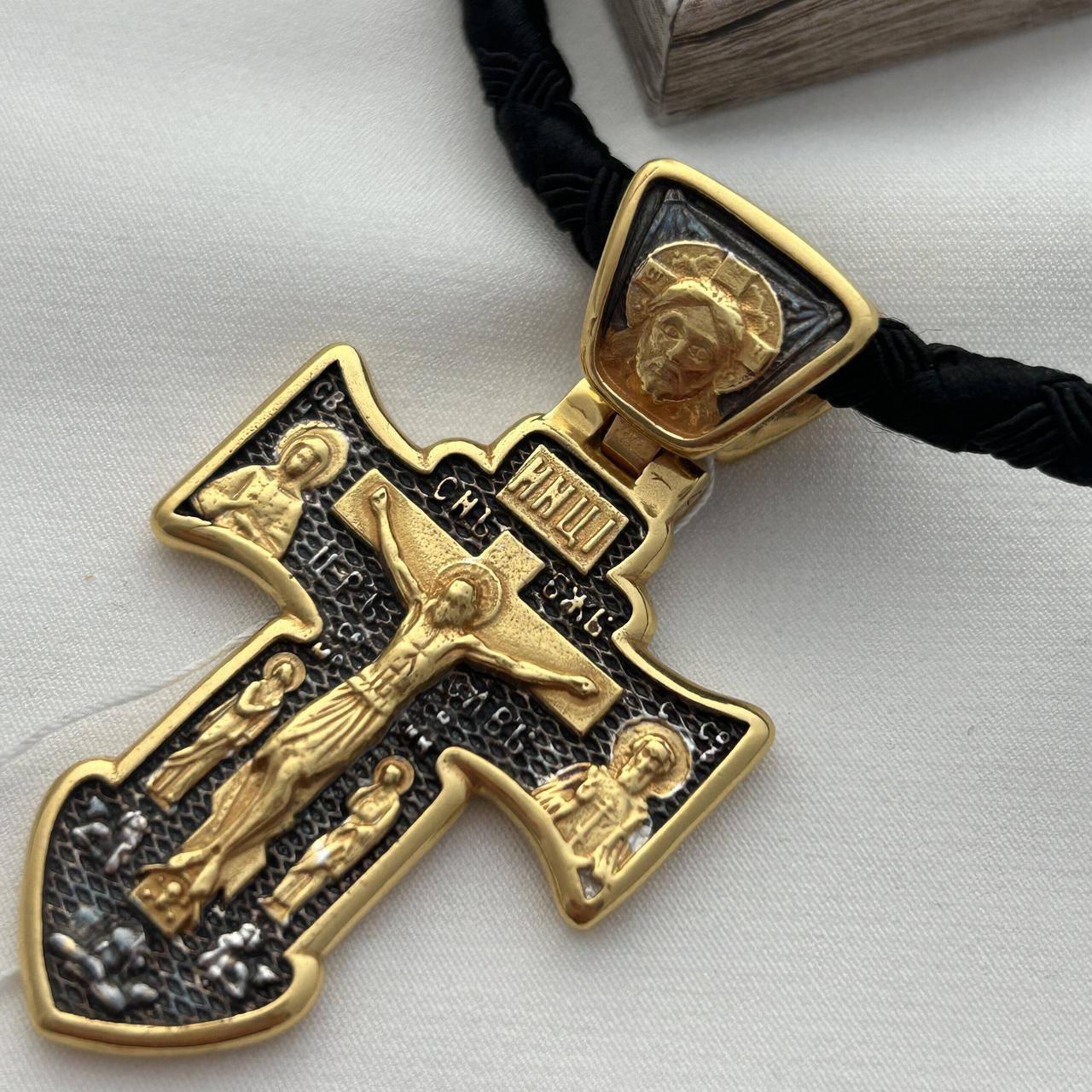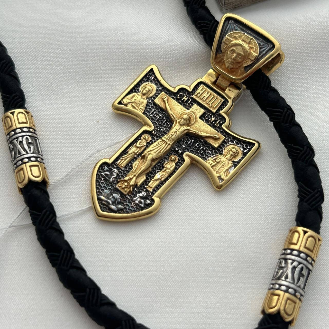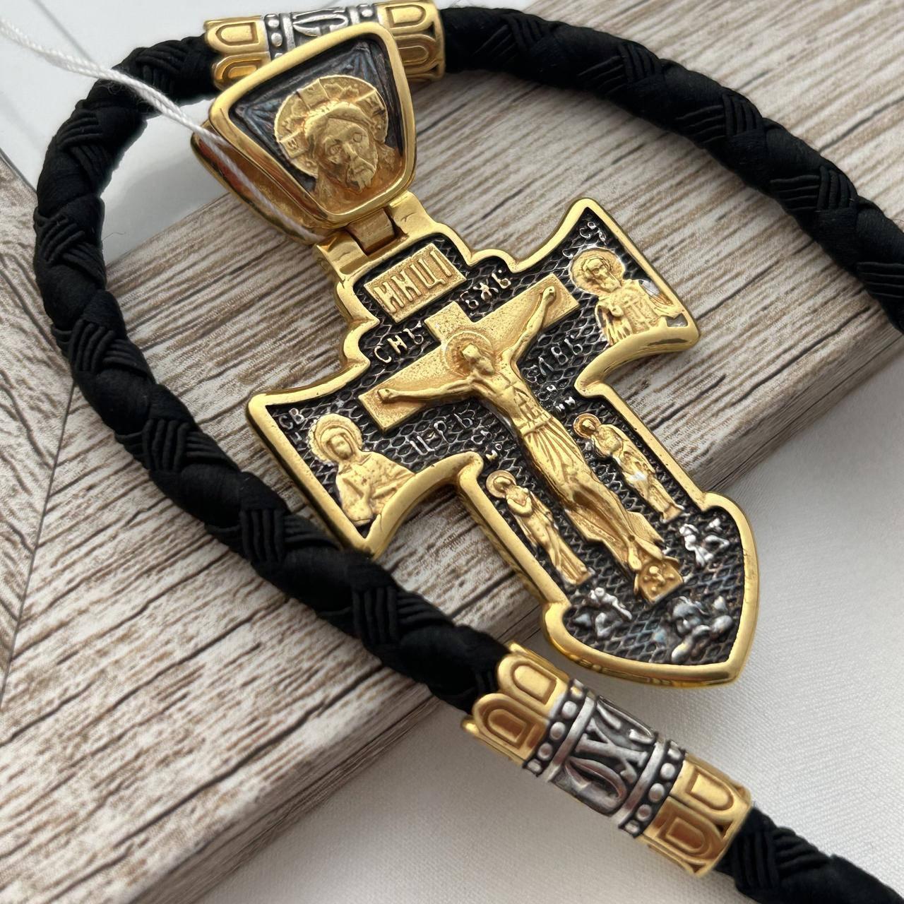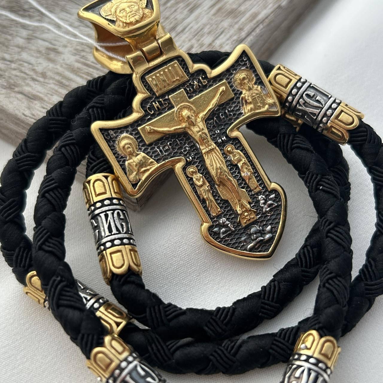 Комплект хрестик срібний з чорнінням і позолотою та нейлоновий шнурок з охоронним написом чоловічий
