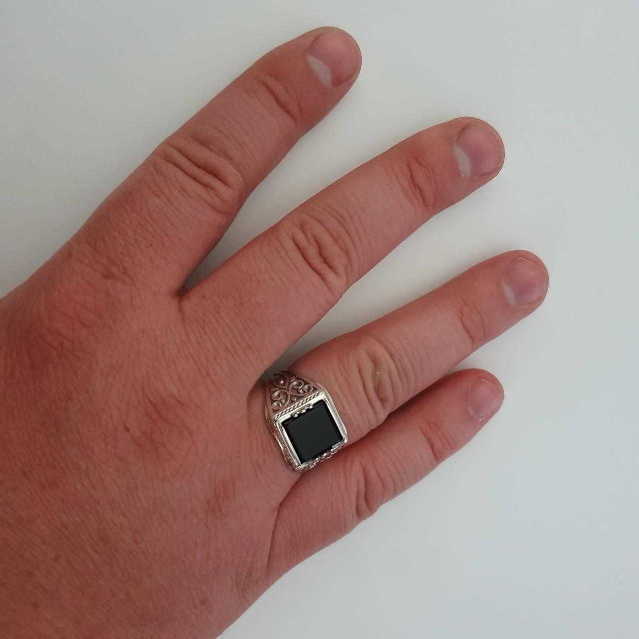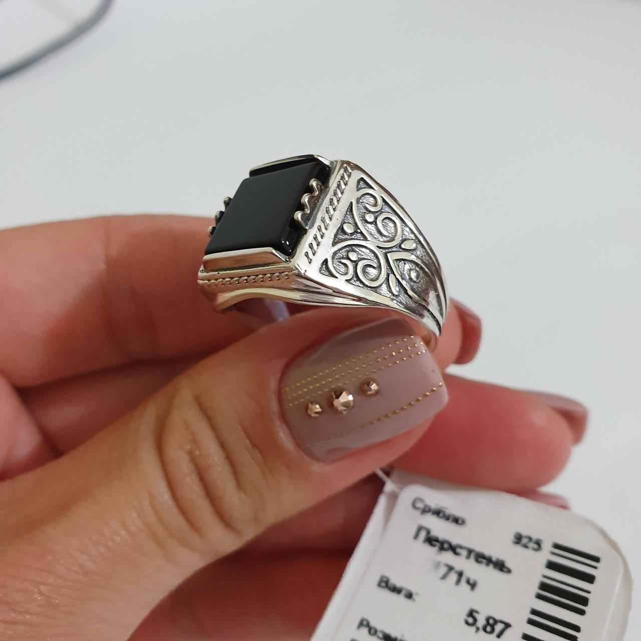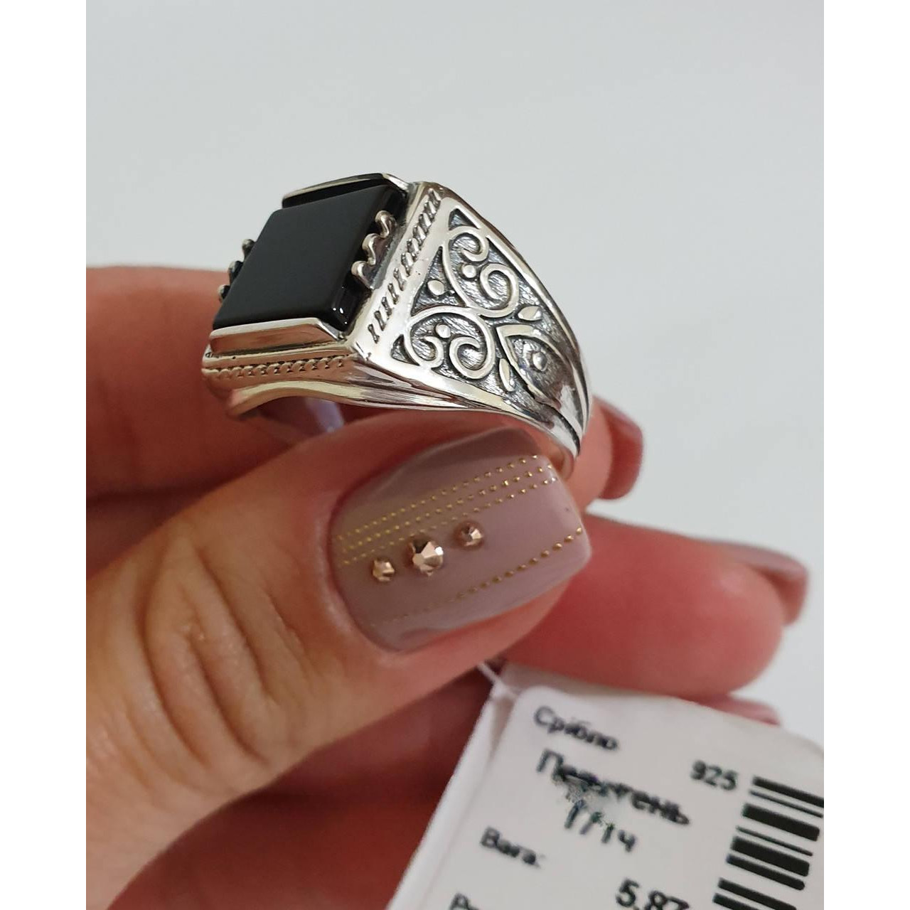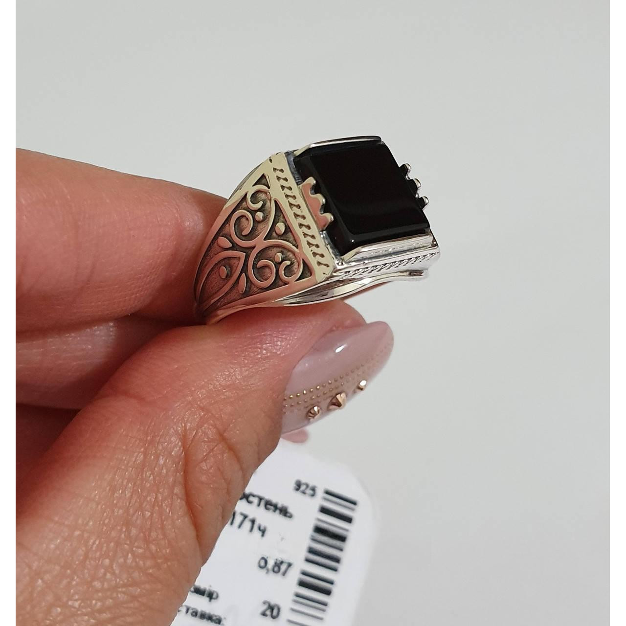 Перстень чоловічий з оніксом та стародавнім орнаментом 171ч прикрашений не тільки гарним чорним каменем, а й гибоким орнаментом з боків виробу, що об'ємно виділяється на фаланзі пальця, підкреслюючи всю композицію виробу. Чоловік з печаткою на руці виглядає стильно, а якщо це ще й перстень з магічним оніксом, то ще й переконливо. Гарна робота майстра. Орнамент гарно відтіняє матовий блиск благородного каменя-вставки. Всі кольори чоловічого персня виглядают разом гармонійно та стильно.