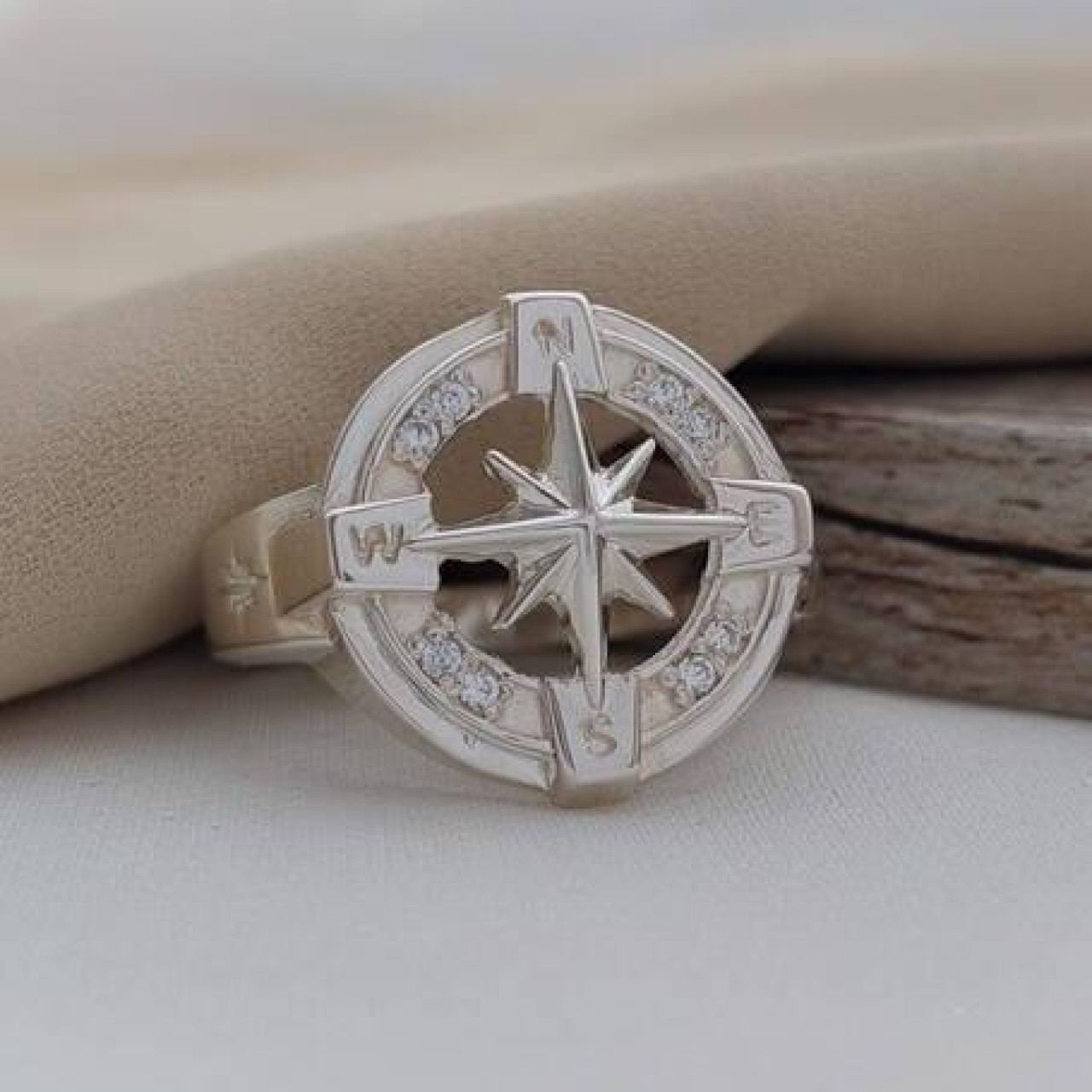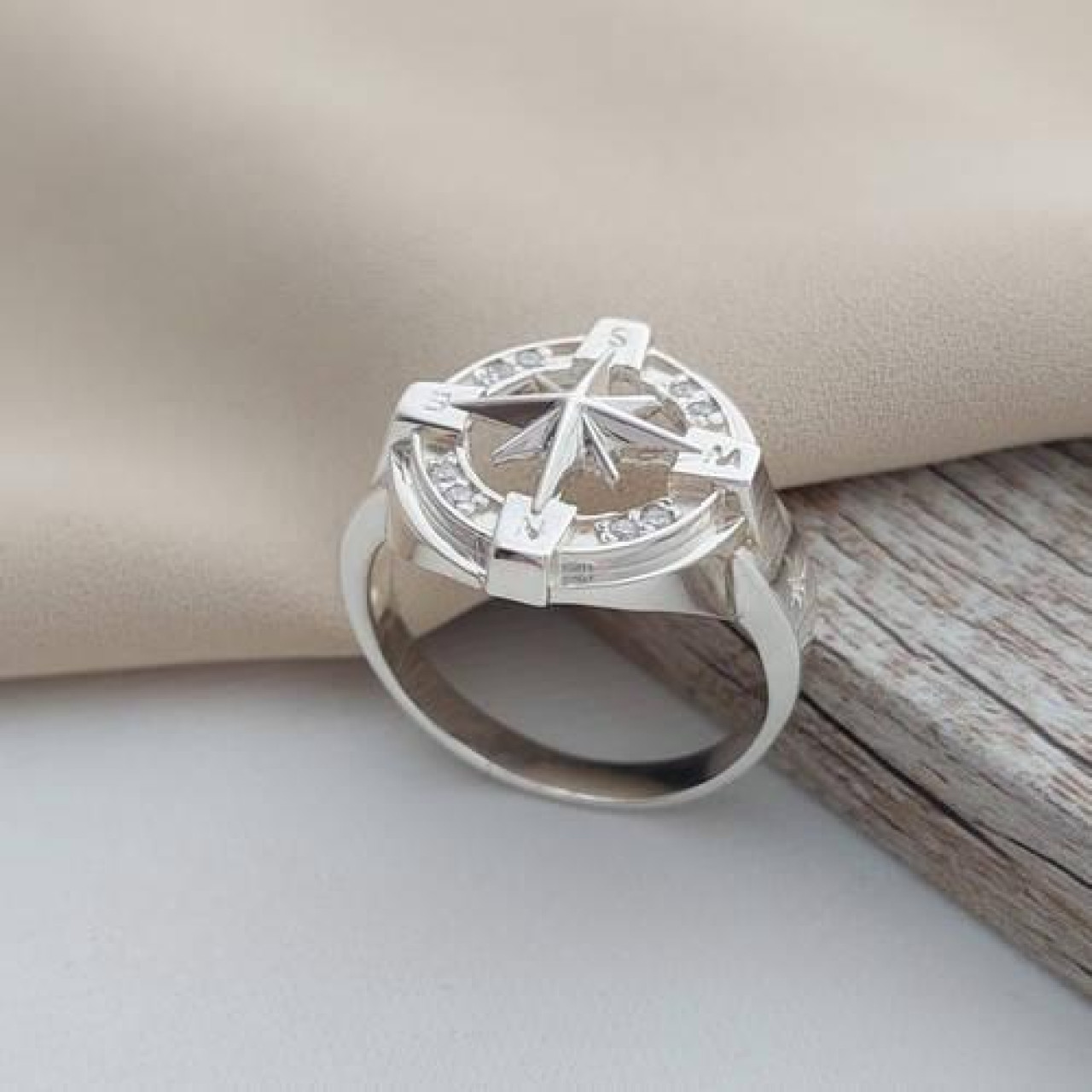 Перстень срібний Роза вітрів з білими фіанітами чоловічий