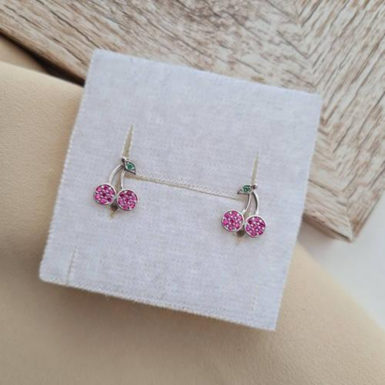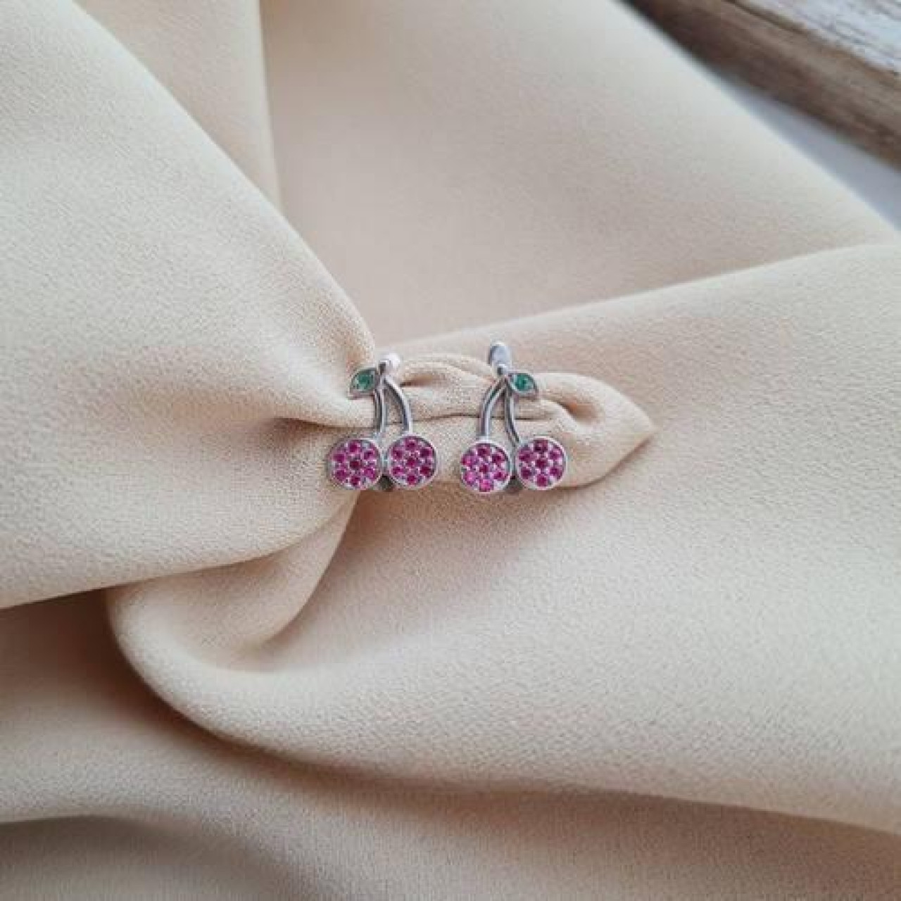 Срібні сережки вишеньки з рожевими та зеленими фіанітами