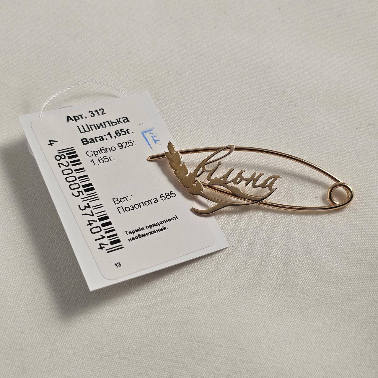 Шпилька брошка срібна з позолотою з колоском і словом Вільна