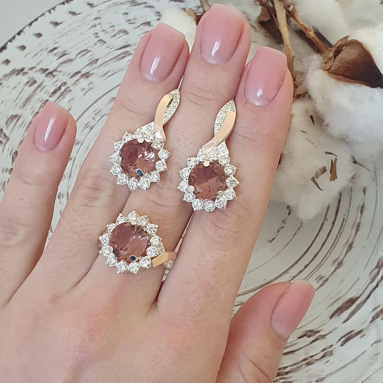 Елегантний і чарівний срібний гарнітур із золотом та кольоровими камінцями складається з каблучок та сережок. Він поєднує в собі певний стиль і два дорогоцінні метали - срібло та золото. Цей срібний комплект із золотом, фіанітами та штучним султанітом виглядає немов квітка. Центр комплекту коричневий камінчик – імітація султаніту, а пелюстки – білі невеликі фіаніти. Камені у цьому незвичайному комплекті завдяки своїм граням переливаються та блищать на сонці. Ніжний дизайн цього жіночого ювелірного гарнітура додасть чарівності та романтичності вашому образу. Виконані кільце та сережки зі срібла 925 проби та золота 375 проби. Ювелірні прикраси із поєднанням срібла та золота користуються популярністю вже не перший рік. Догляд за таким комплектом ювелірних прикрас дуже простий - раз на місяць промивайте його в мильній воді і просушуйте рушником і він радуватиме вас дуже довго своїм блиском і сяйвом.