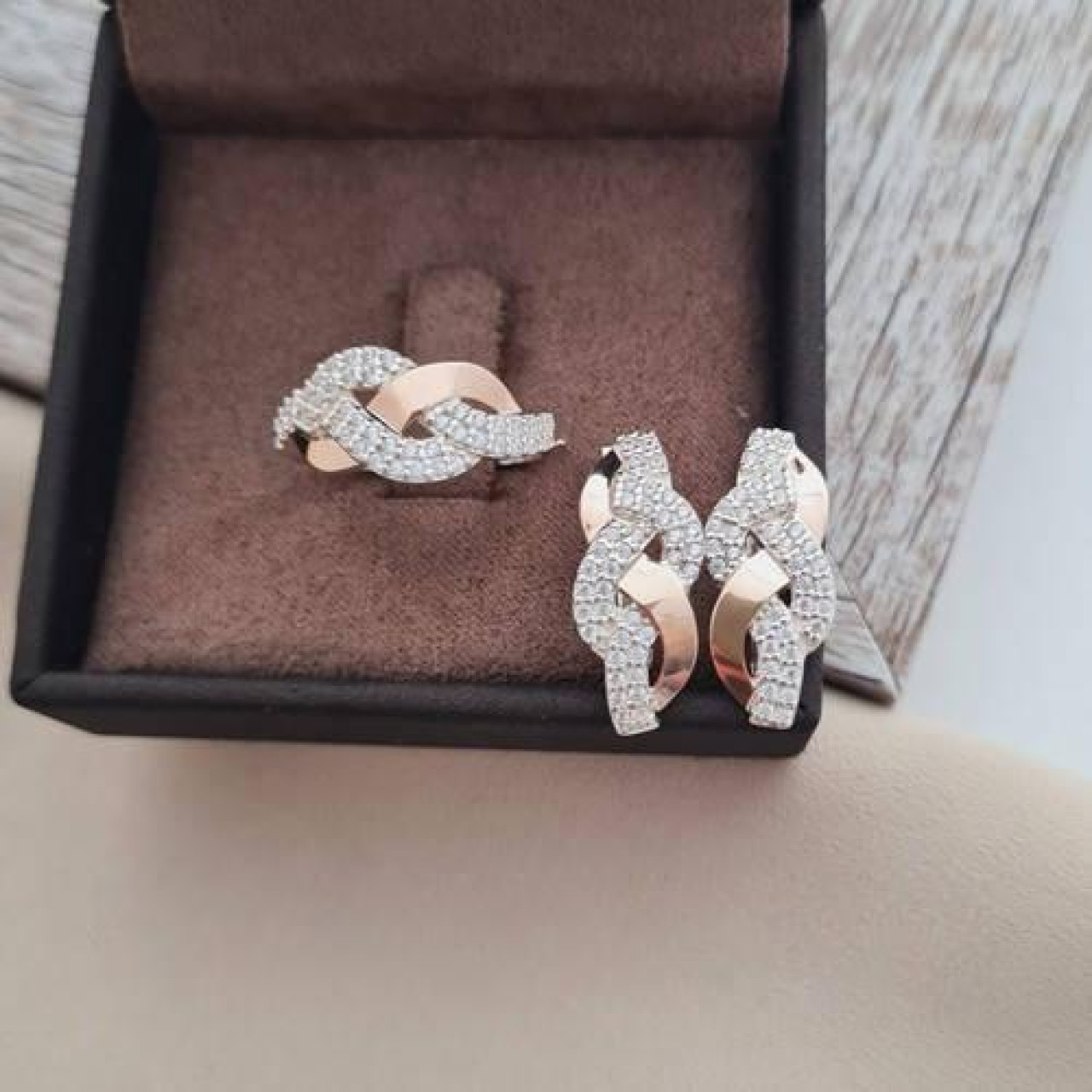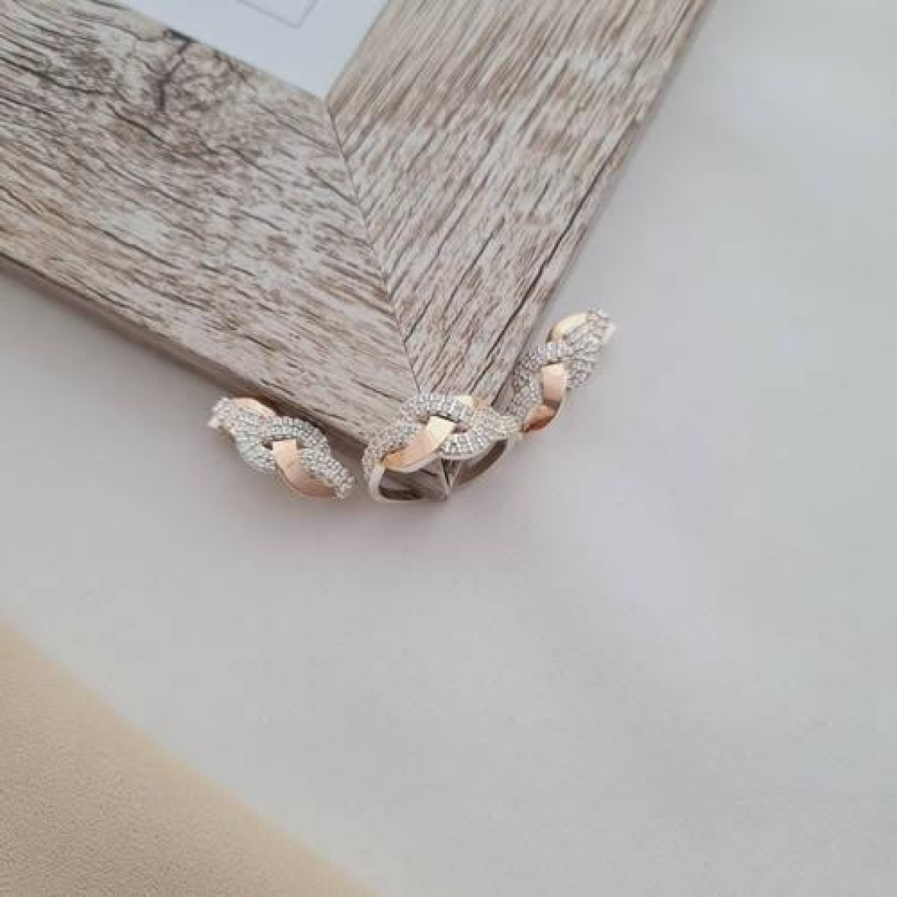 Срібний масивний комплект із золотими пластинами 086-Н - втілення вишуканості та витонченого смаку. Комплект включає каблучку та сережки, об'єднані гармонійним дизайном, у якому центральне місце посідає складне переплетення срібних елементів і золотих акцентів. Золоті напайки м'яко відтіняють холодний блиск срібла, створюючи неповторний контраст, який привертає погляд. На особливу увагу заслуговують білі циркони, акуратно розташовані на кожному елементі комплекту. Їхнє сяйво немов оживляє прикрасу, додаючи їй мерехтливої легкості та повітряності. Ці кристали, що виблискують під час потрапляння світла, підкреслюють витонченість кожної лінії та надають прикрасі благородного вигляду. Каблучка та сережки зі срібла з золотими напайками 086-Н стане універсальним доповненням до вашого гардеробу, легко поєднуючись як з повсякденними образами, так і з вечірніми вбраннями. Сережки чудово підкреслять лінію шиї та овал обличчя, а каблучка стане елегантним акцентом на руці. Разом вони створюють закінчений ансамбль, що ідеально підходить для урочистих заходів, романтичних вечерь або зустрічей з друзями. Срібні сережки з золотом, що мають надійні англійські замки, надійно триматимуться в мочках вух. Каблучка зі срібла з золотими напайками має наступні розміри: 15, 15,5, 16, 16,5, 17, 17,5, 18, 18,5, 19, 19,5, 20, 20,5, 21. Виготовлений комплект прикрас зі срібла 925 проби та золота 375 проби. Догляд за таким ювелірним гарнітуром дуже простий - раз на місяць промивайте його в мильній воді та просушуйте рушником, і він буде радувати вас дуже довго своїм блиском і сяйвом.