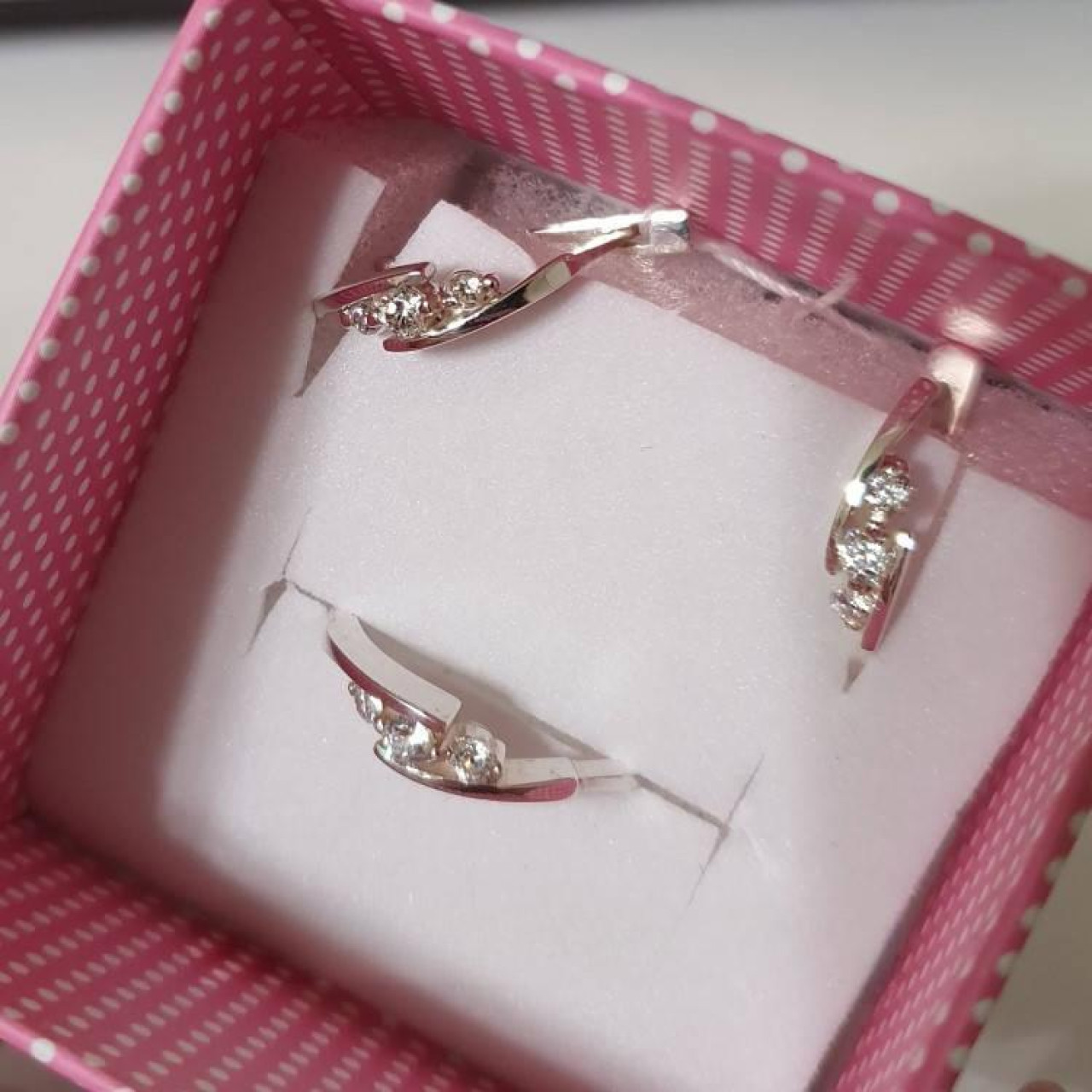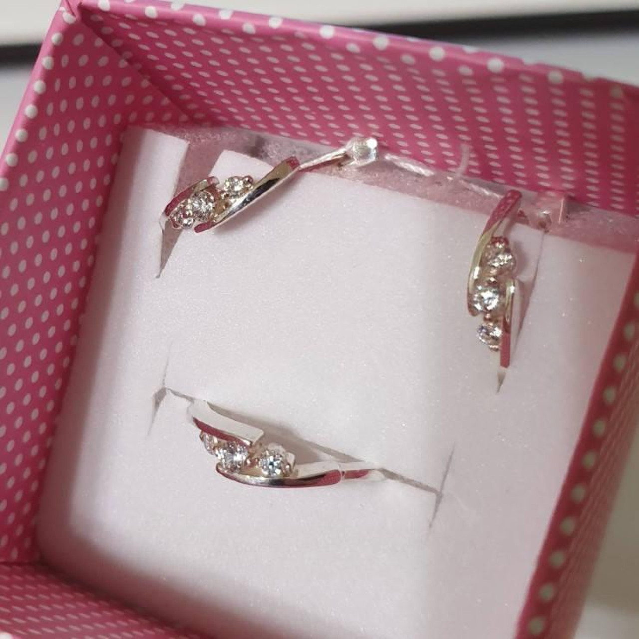 Красивий срібний комплект прикрас складається з каблучки та сережок. Срібло 925 проби ідеально підходить до яскравих фіанітів, а оригінальна форма оправи каменю надають особливий вигляд прикрасам. Срібло неначе охоплює й намагається обгорнути камінчики з обох боків. Срібні сережки мають надійну "англійську" застібку, а саме зручну у використанні. Прикраси довго зберігатимуть магазинний вигляд, але відповідний догляд за будь-якими прикрасами звичайно має бути. Наприклад, намагайтеся знімати ювелірні вироби при купанні чи відвіданню спортивного залу. Цей комплект може стати подарунком для найближчого заходу або ж Дня народження Ваших близьких.